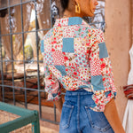 Tissu effet patchwork avec un mélange harmonieux de motifs floraux et de pois, jeu de couleurs vives (rouge, bleu ciel, jaune), col chemise, fermeture boutonnée sur le devant, poignets boutonnés, finitions soignées.