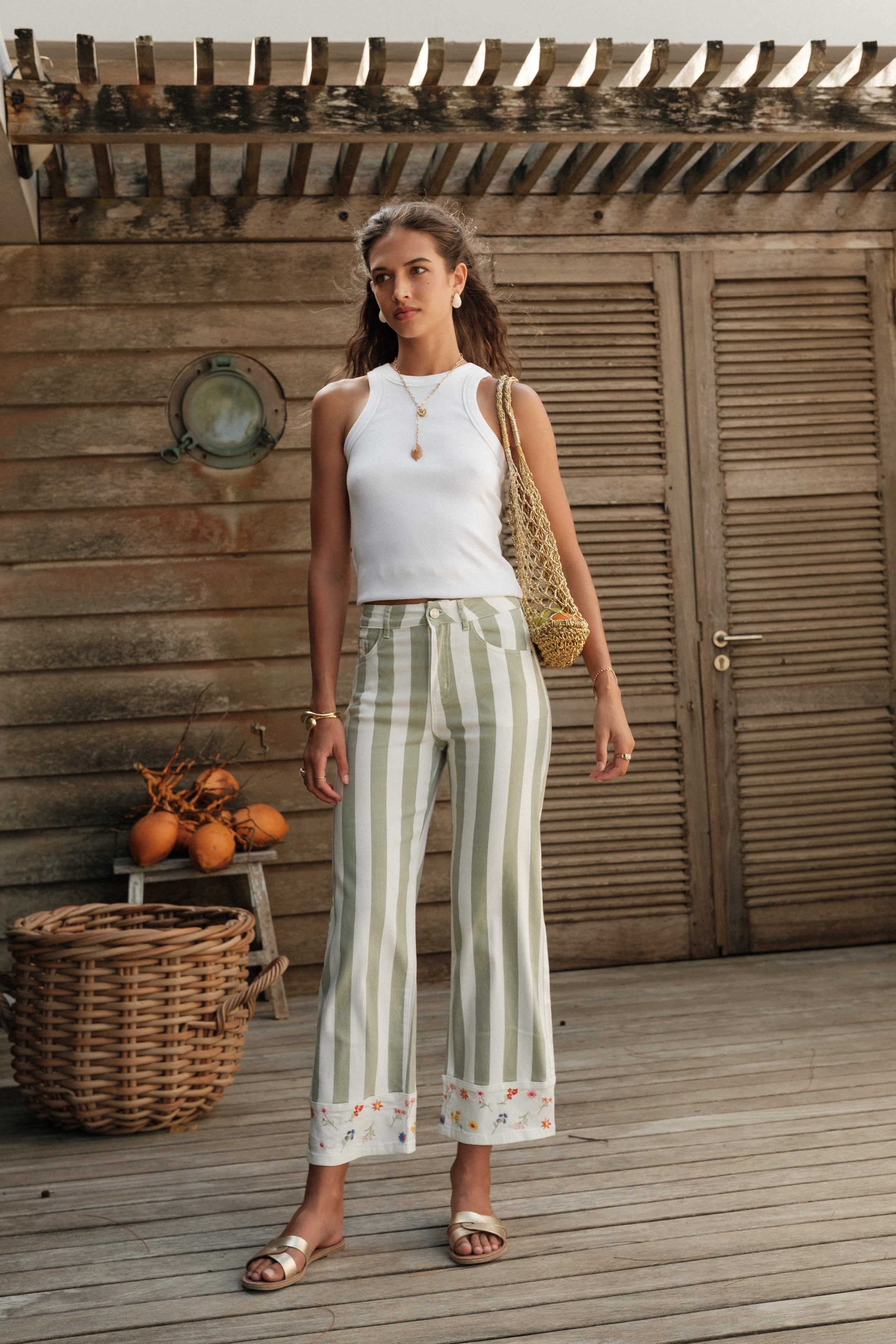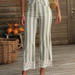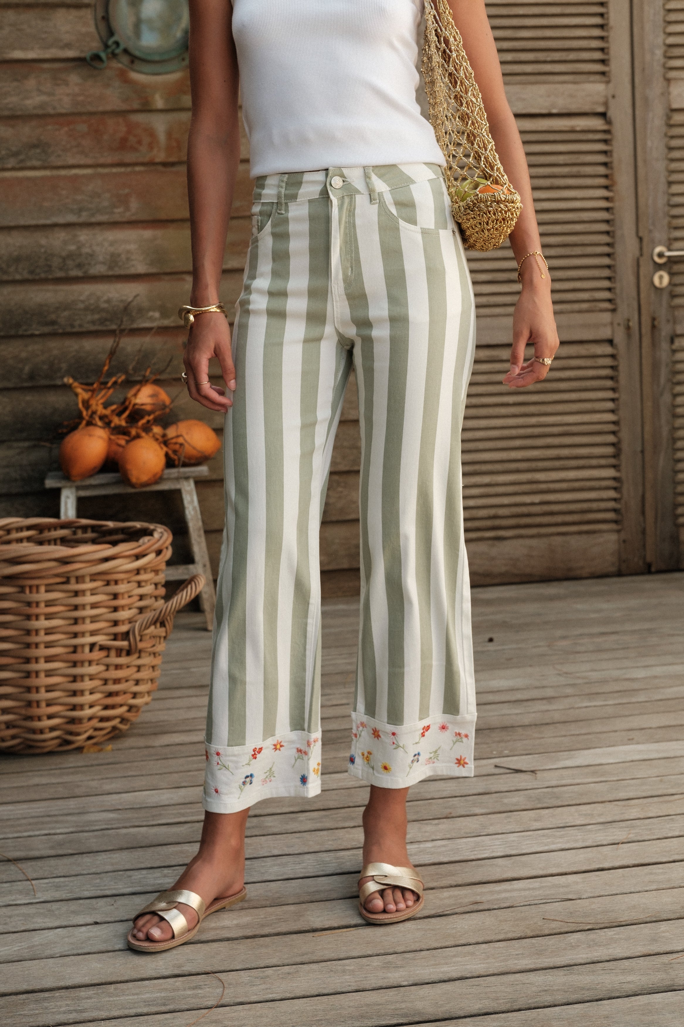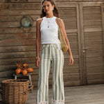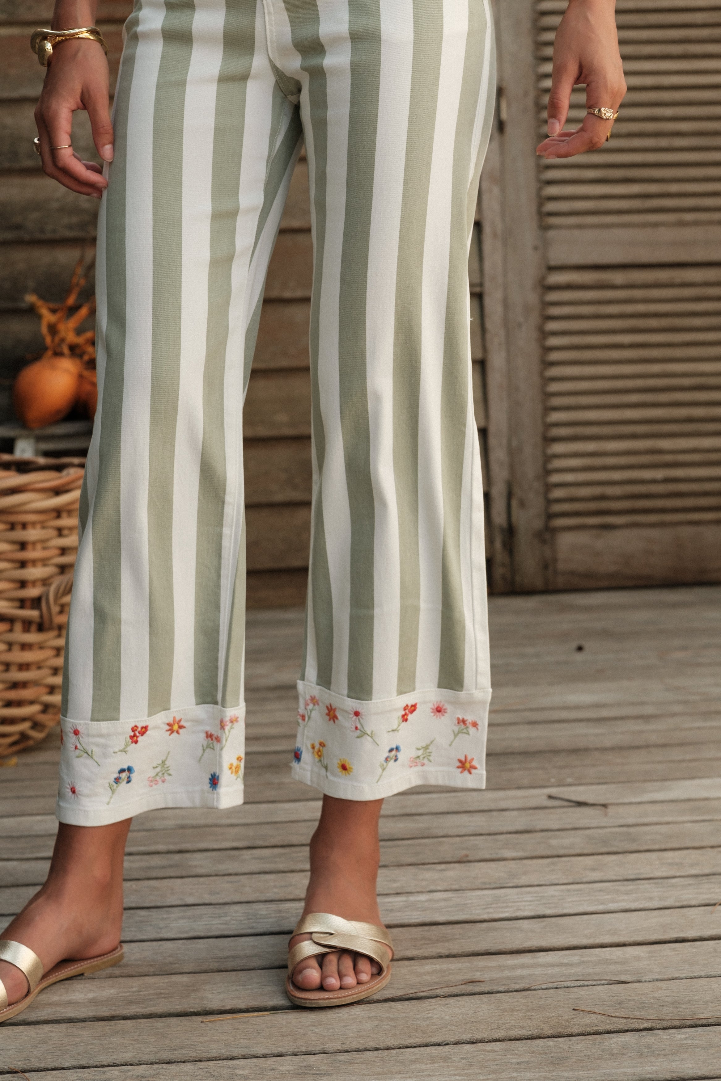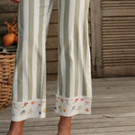 Détails : Denim imprimé rayures et écru (non tissé). Bas de jambe orné de petites fleurs brodées, détail délicat qui signe la pièce. Poches classiques, finitions nettes, esprit estival.