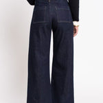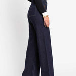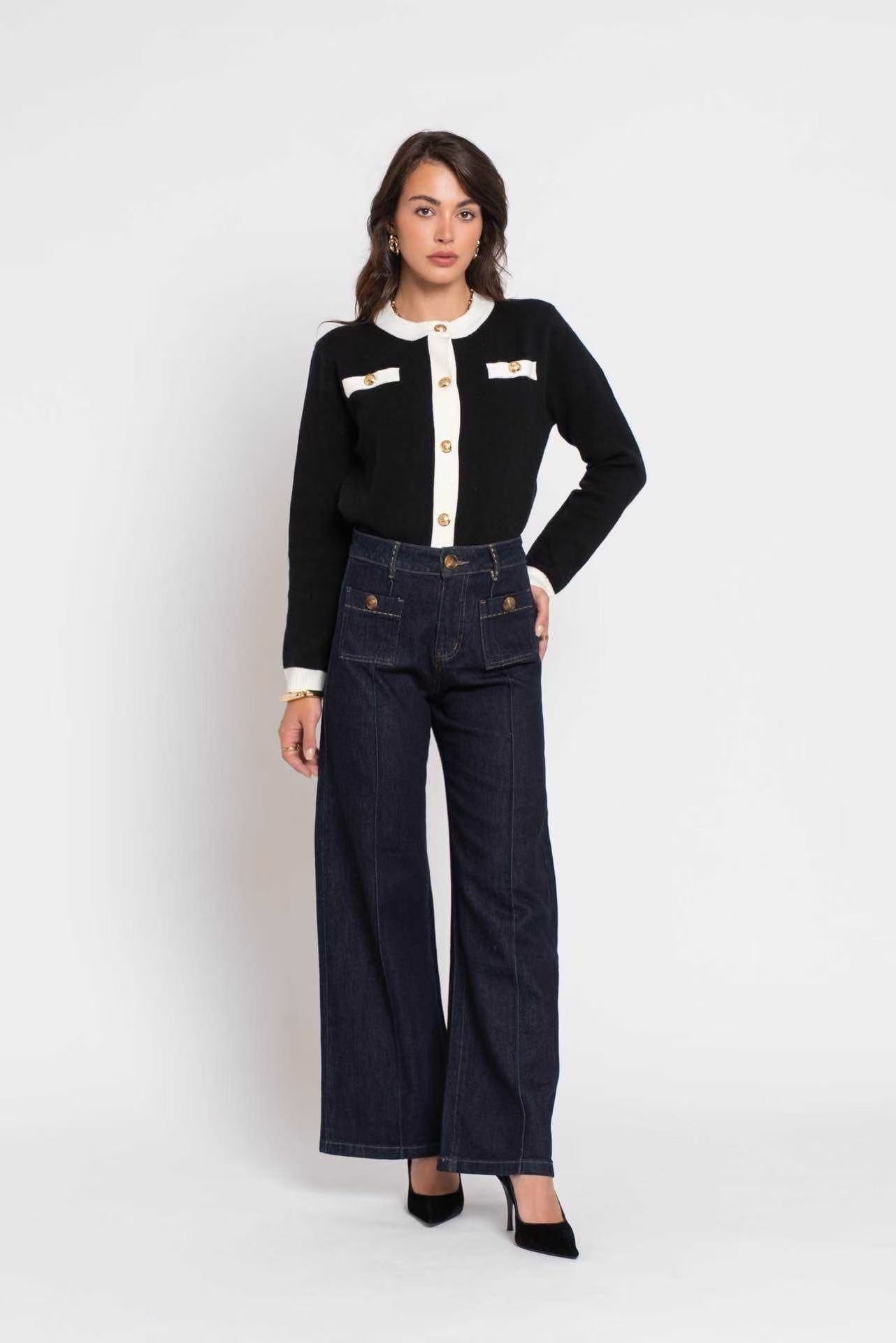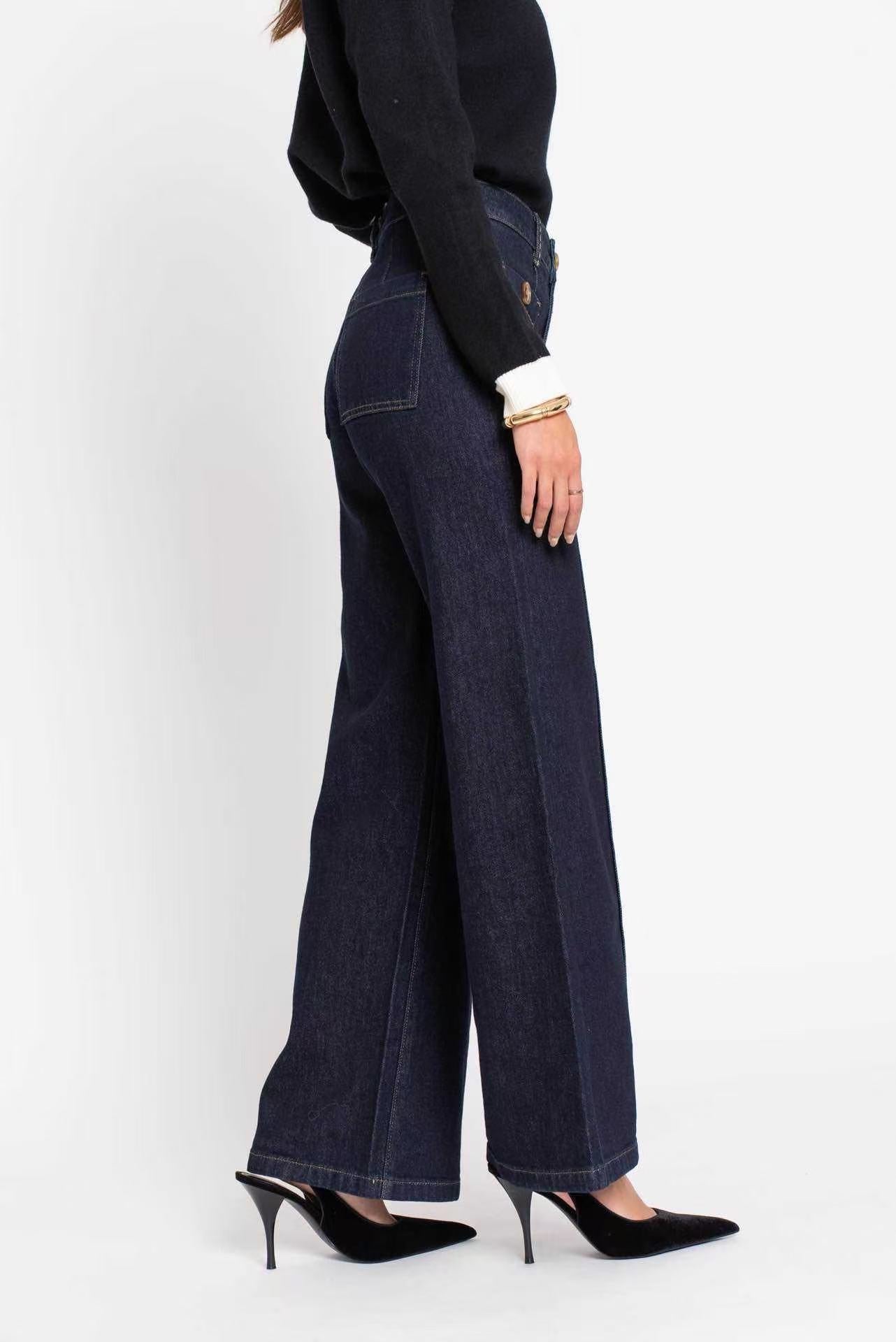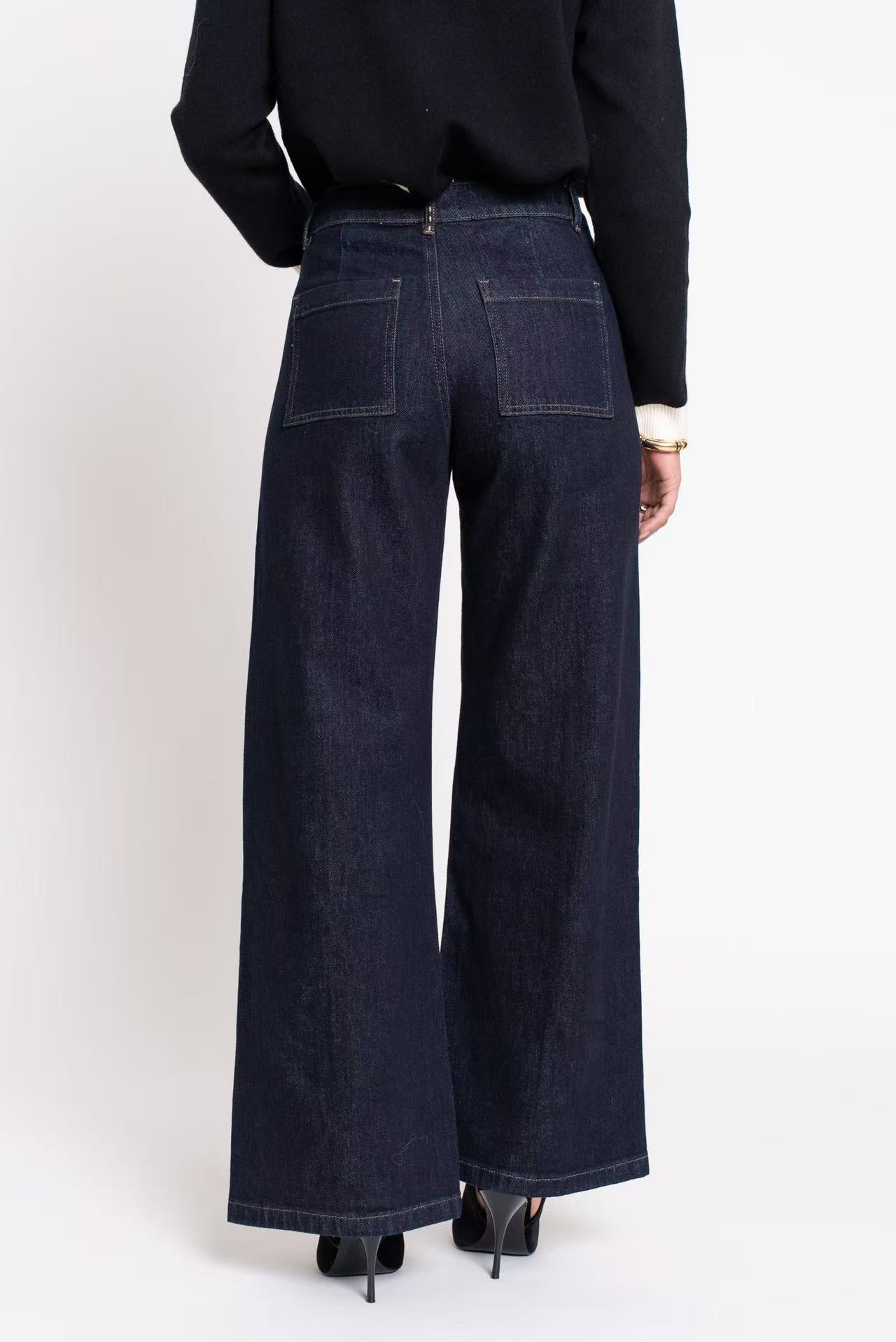 Coupe : Taille haute, jambe wide leg et poches carrées.