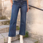 Coupe : Taille haute, jambe wide leg et poches carrées avec boucle.