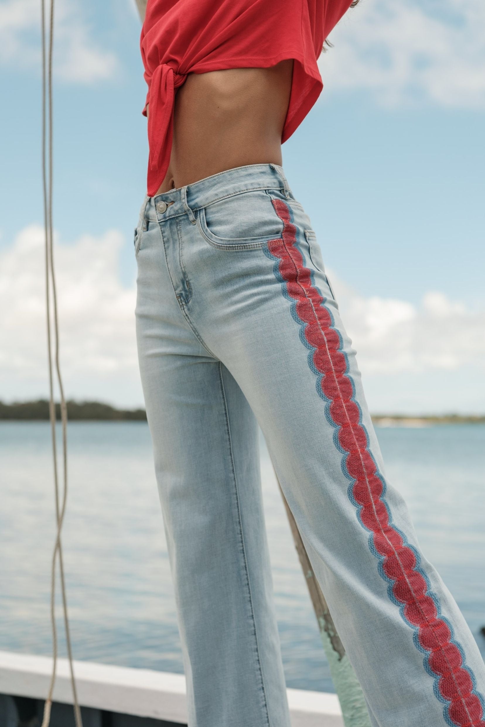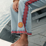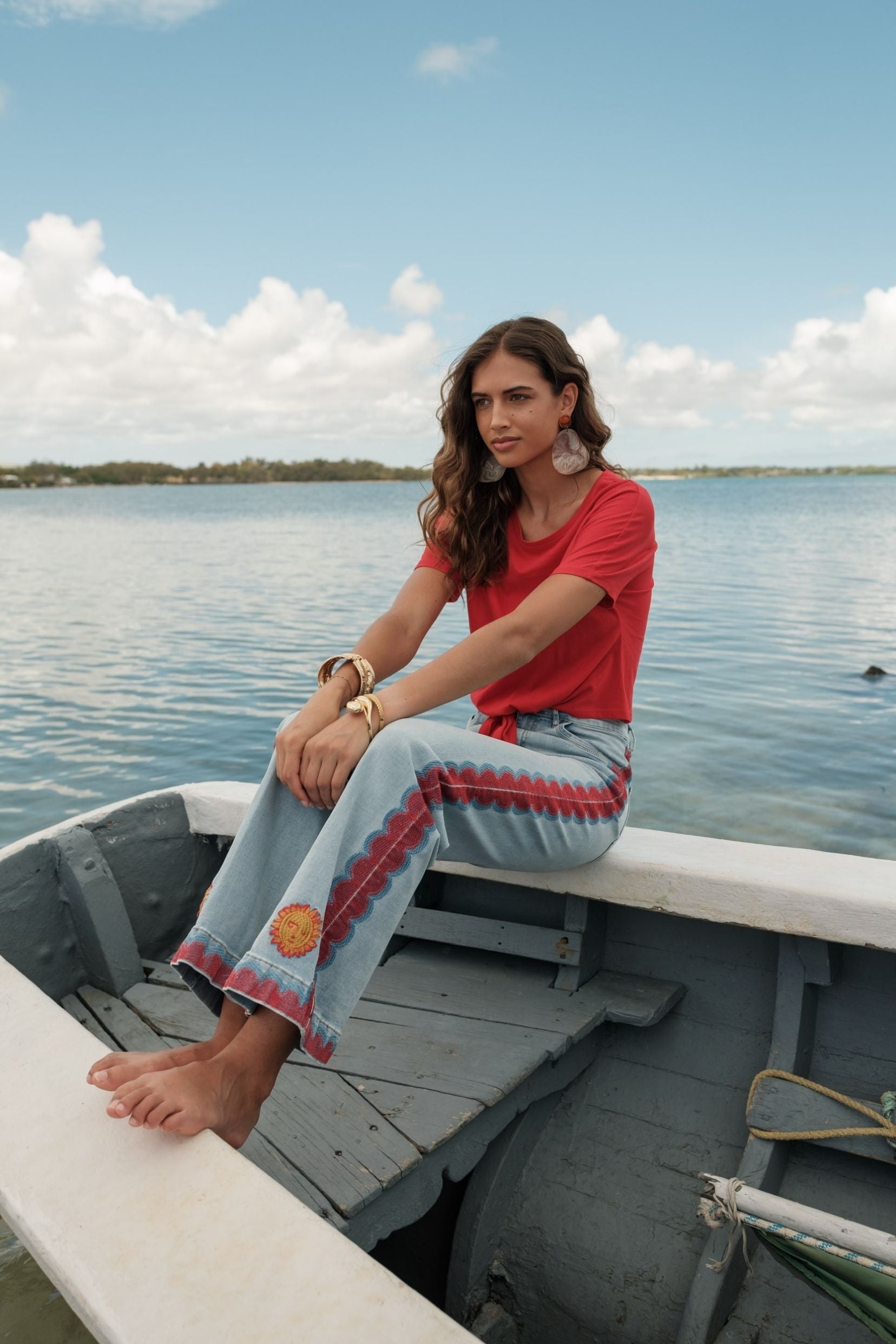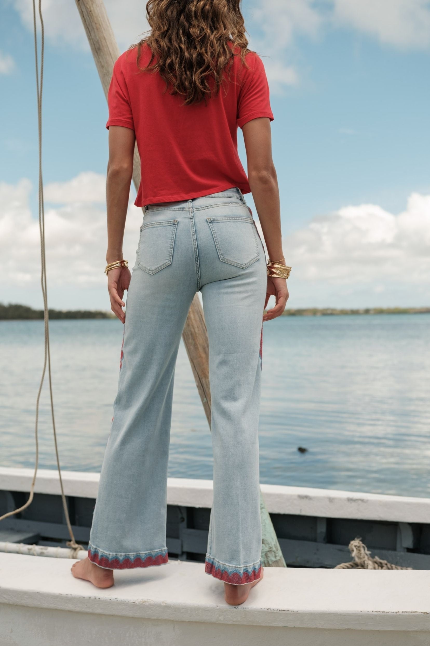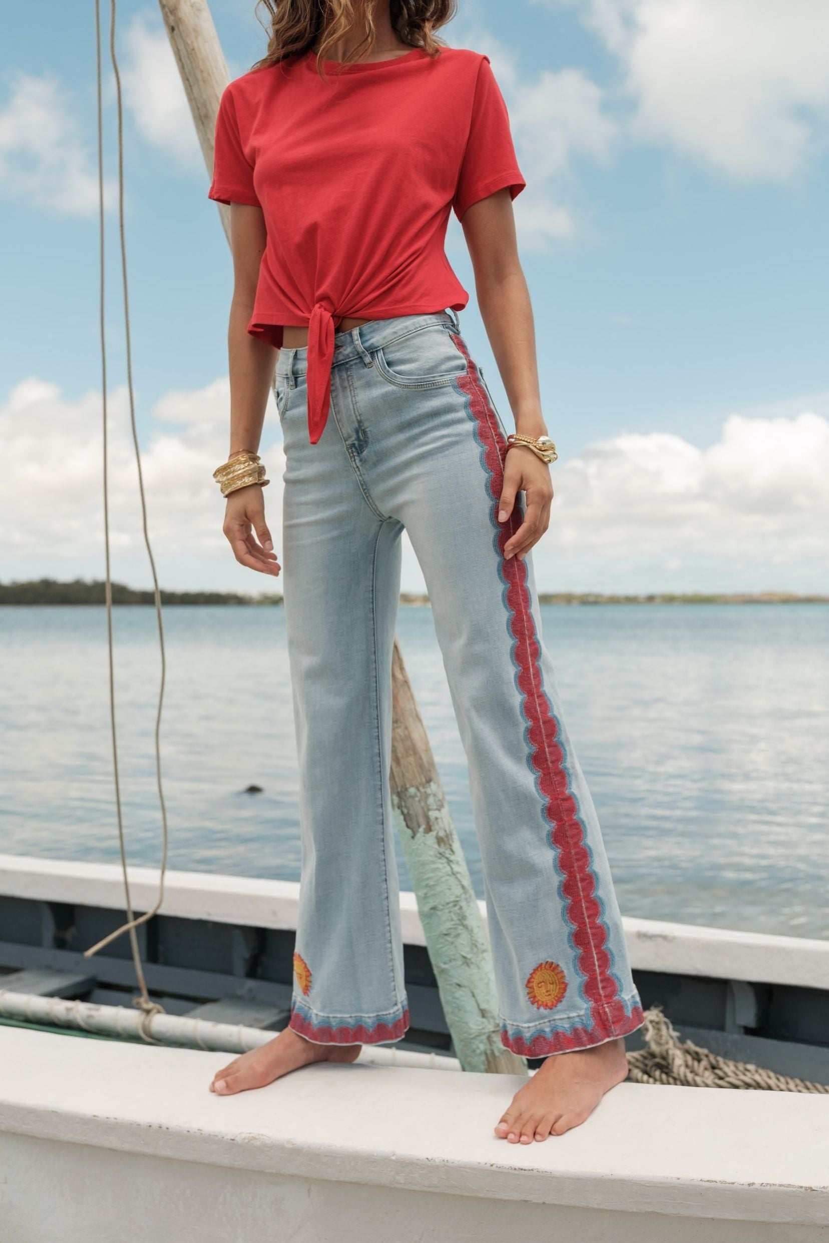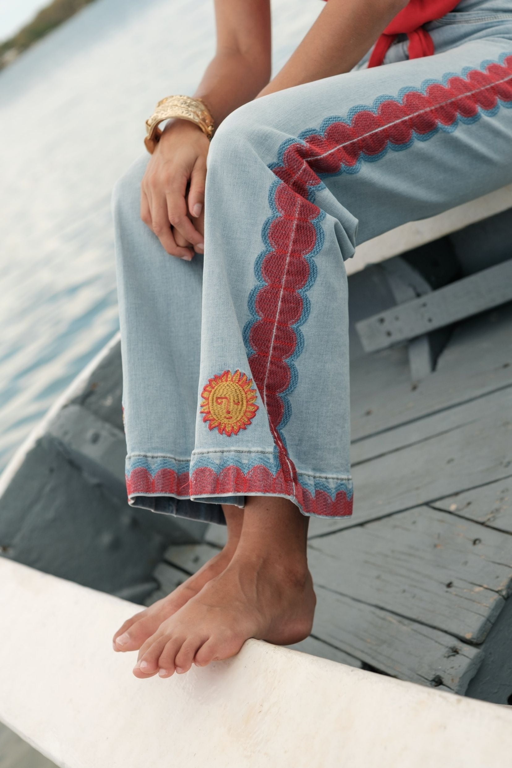 Détails : Toile de denim coton stretch légère. Bandes brodées contrastées sur les côtés, finition décorative en bas de jambe et broderie soleil signature. 5 poches et passants pour ceinture.