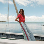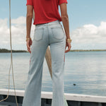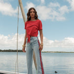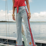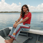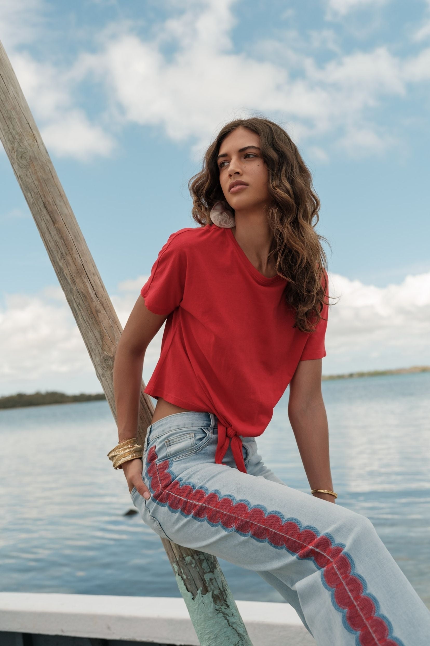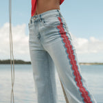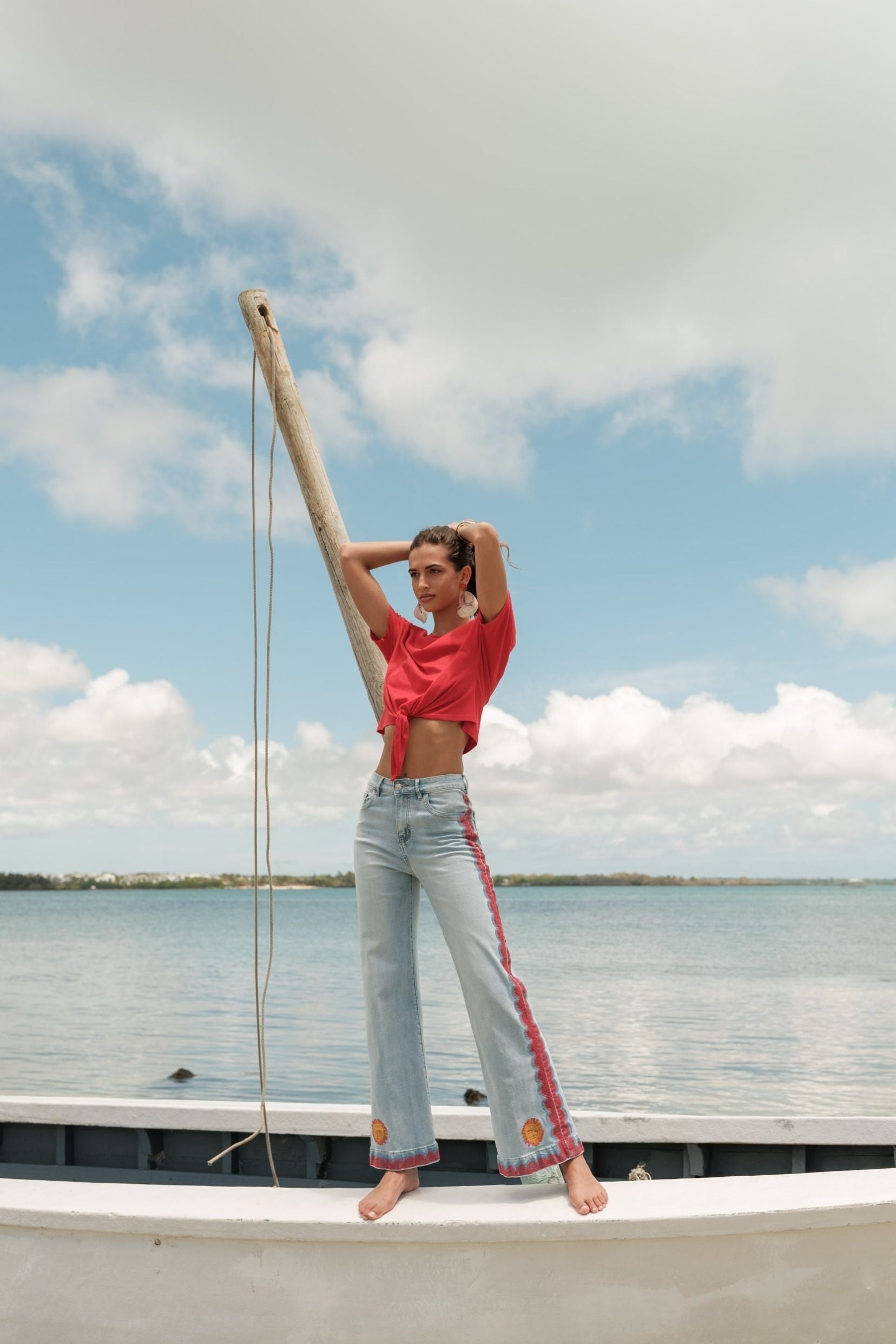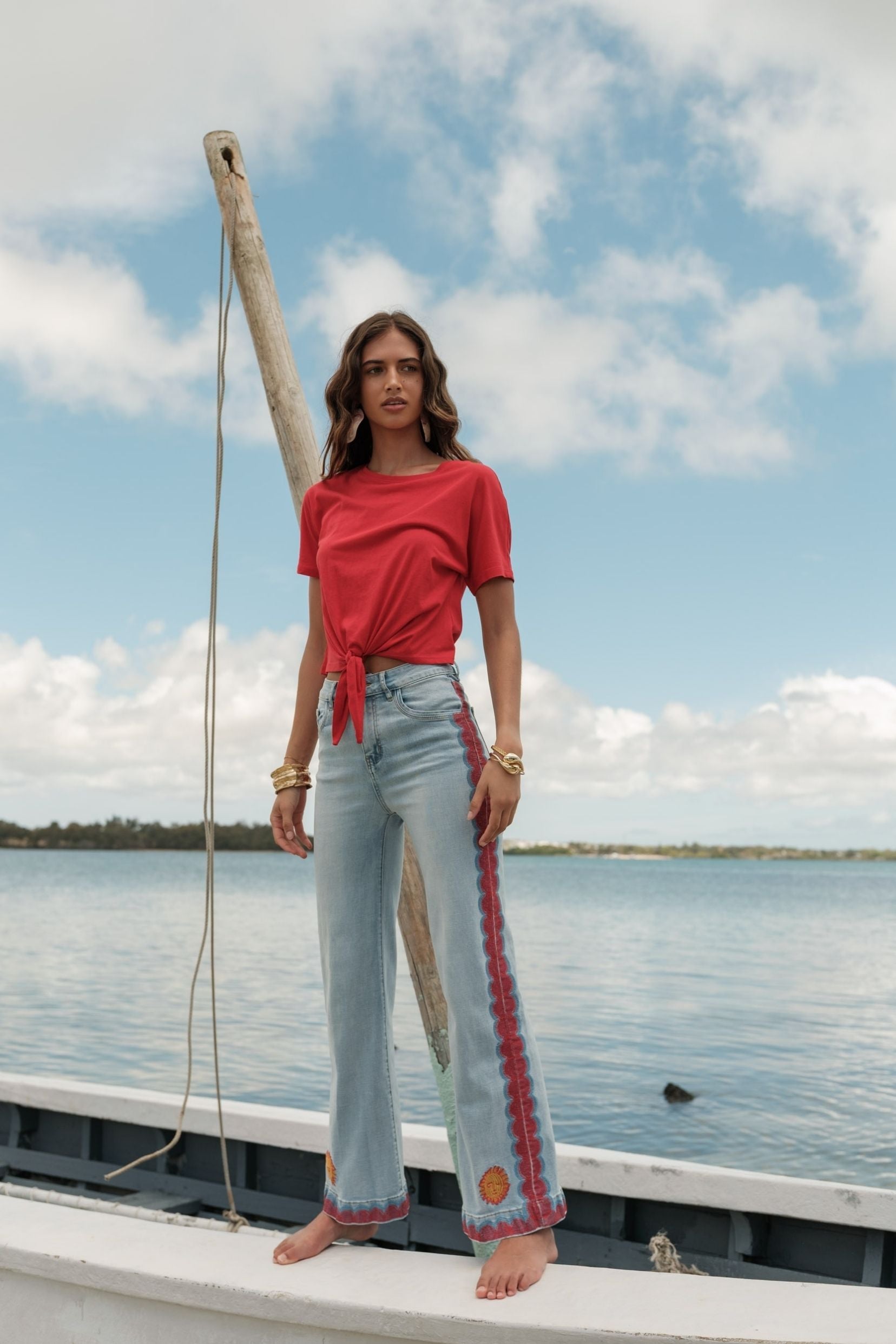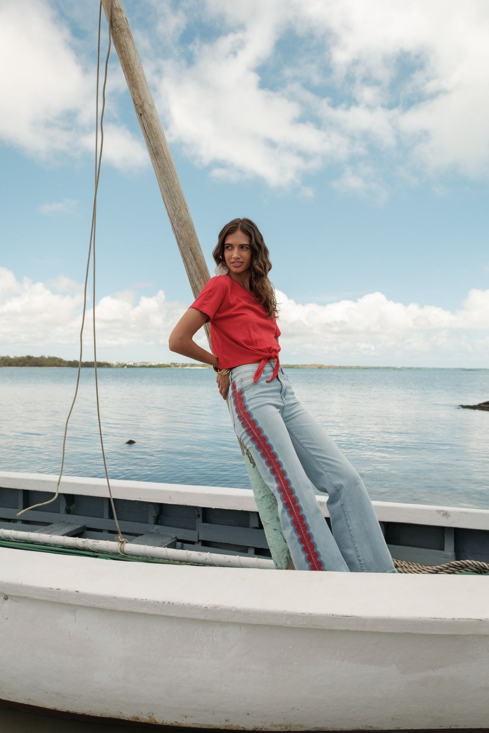 Détails : Toile de denim coton stretch légère. Bandes brodées contrastées sur les côtés, finition décorative en bas de jambe et broderie soleil signature. 5 poches et passants pour ceinture.