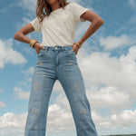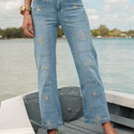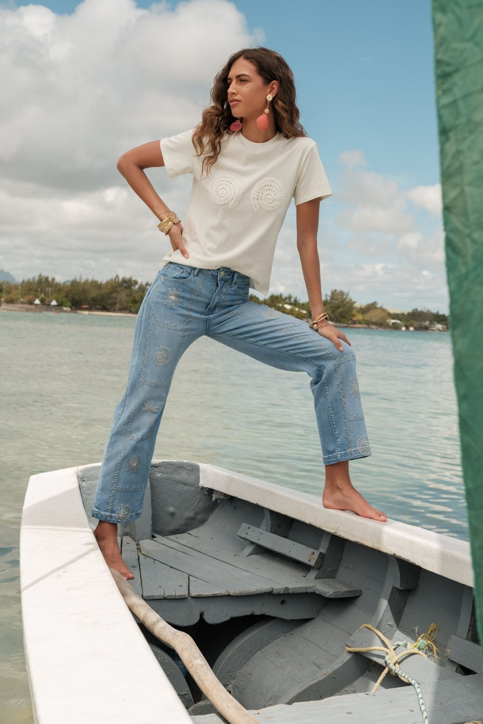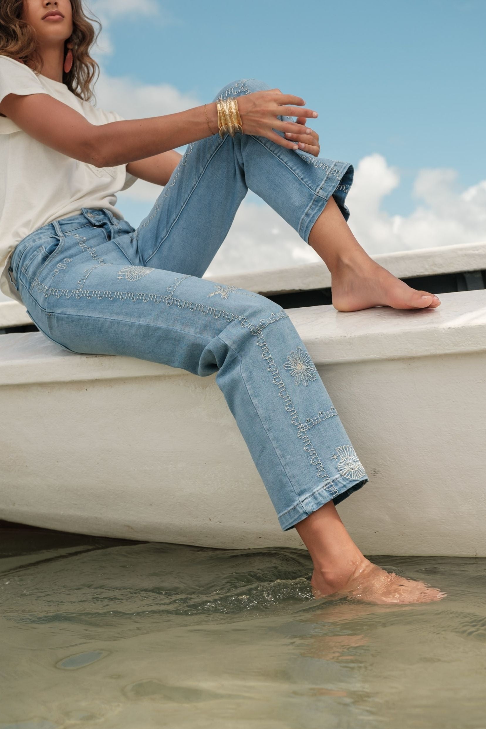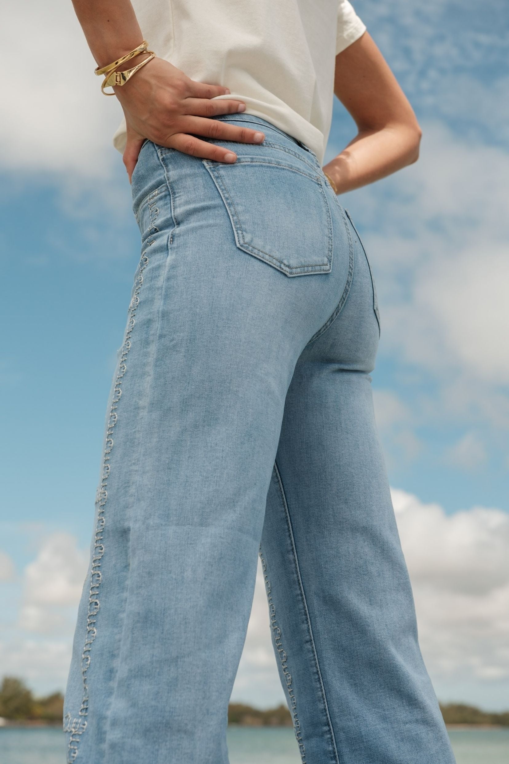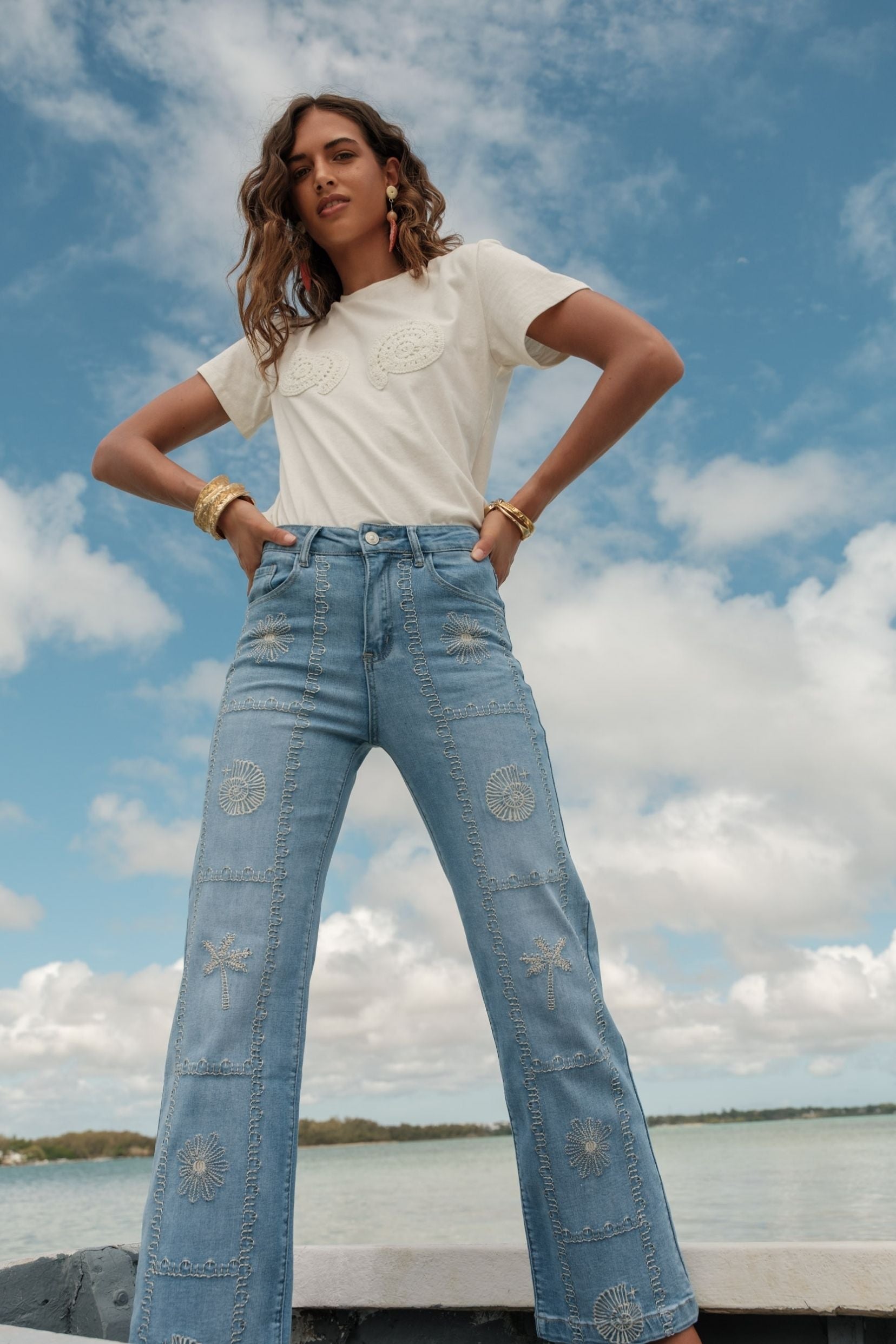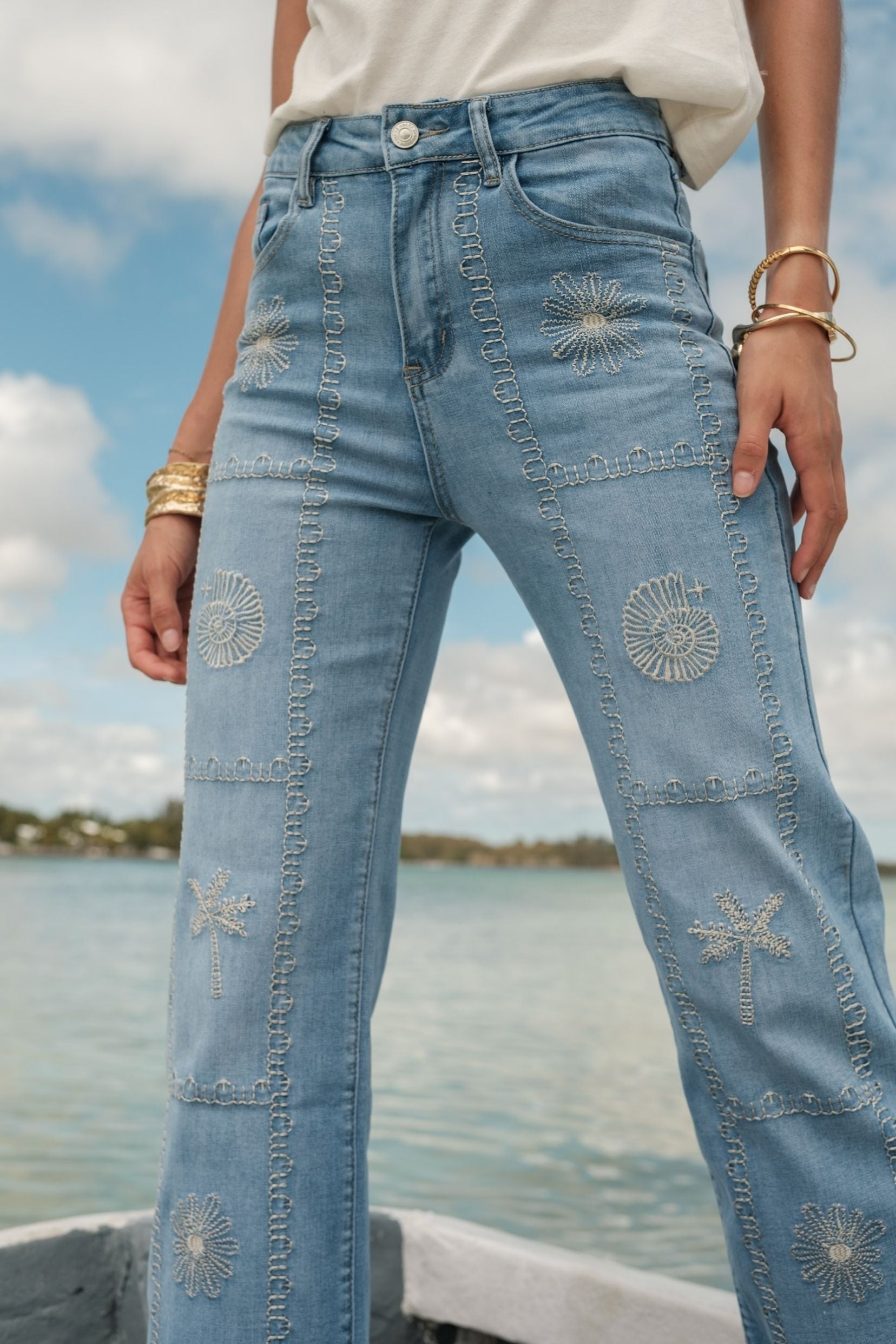 Détails : Denim bleu clair souligné de broderies ton sur ton.