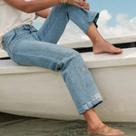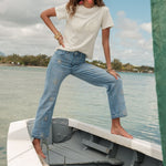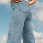 Coupe : Jean taille haute à la jambe droite légèrement évasée.
