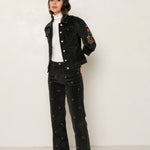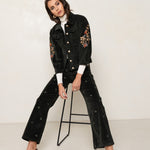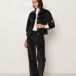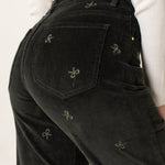 Pantalon en velours avec des broderies all-over de nœuds papillon. Sa coupe large assure un confort élégant, tandis que les broderies délicates apportent une touche ludique et sophistiquée. Cette pièce unique, à la fois chic et originale, est parfaite pour un look tendance et raffiné