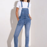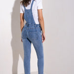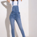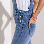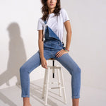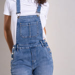 Salopette jean denim slim Sarah. 3 boutons sur chaque côté. 5 poches jeans. Passant ceinture.