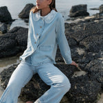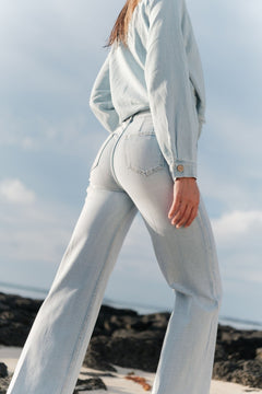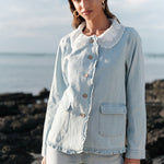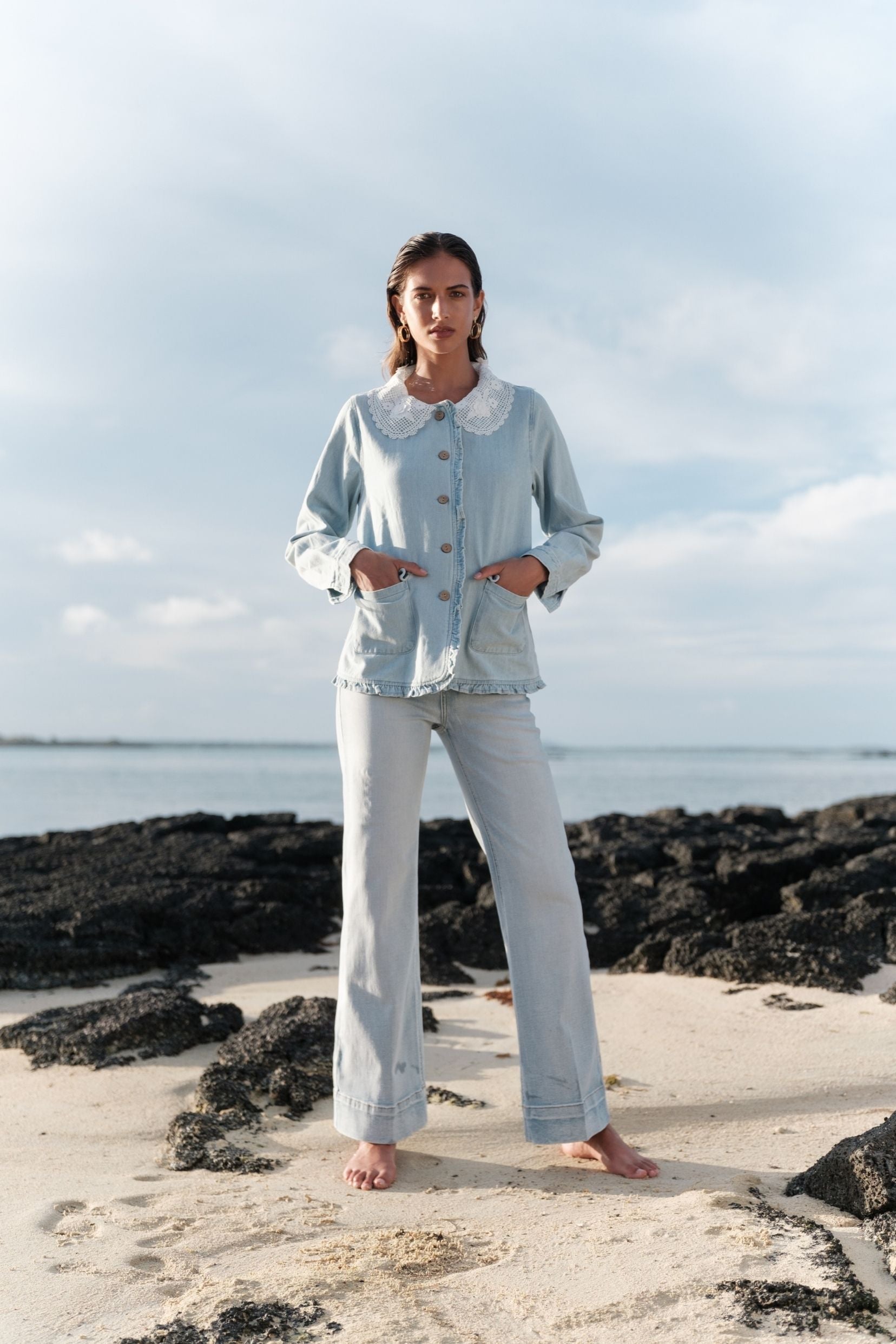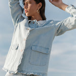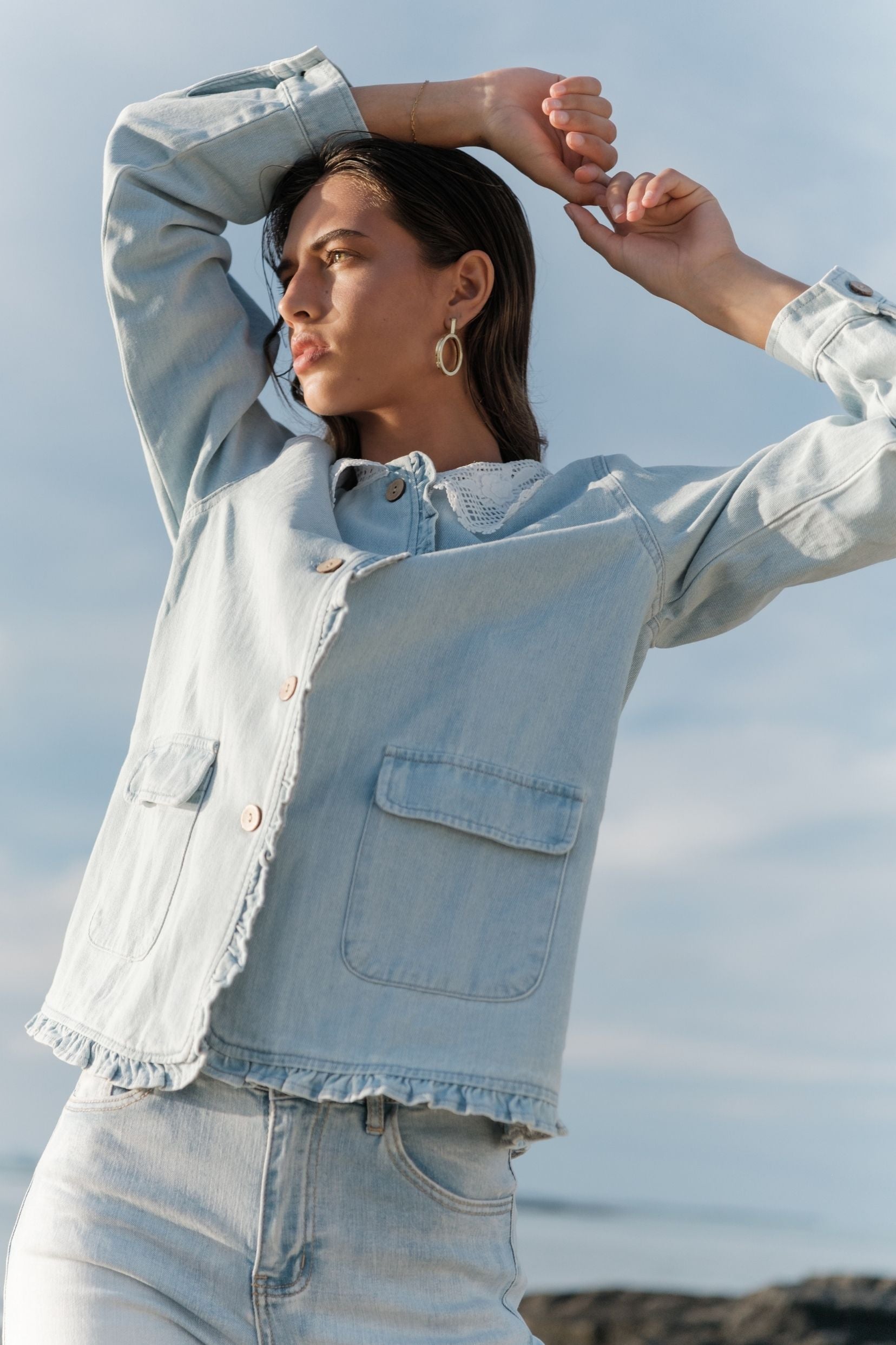 Coupe : Veste en denim clair à la coupe droite et confortable, légèrement ample, pensée pour être portée facilement au quotidien.