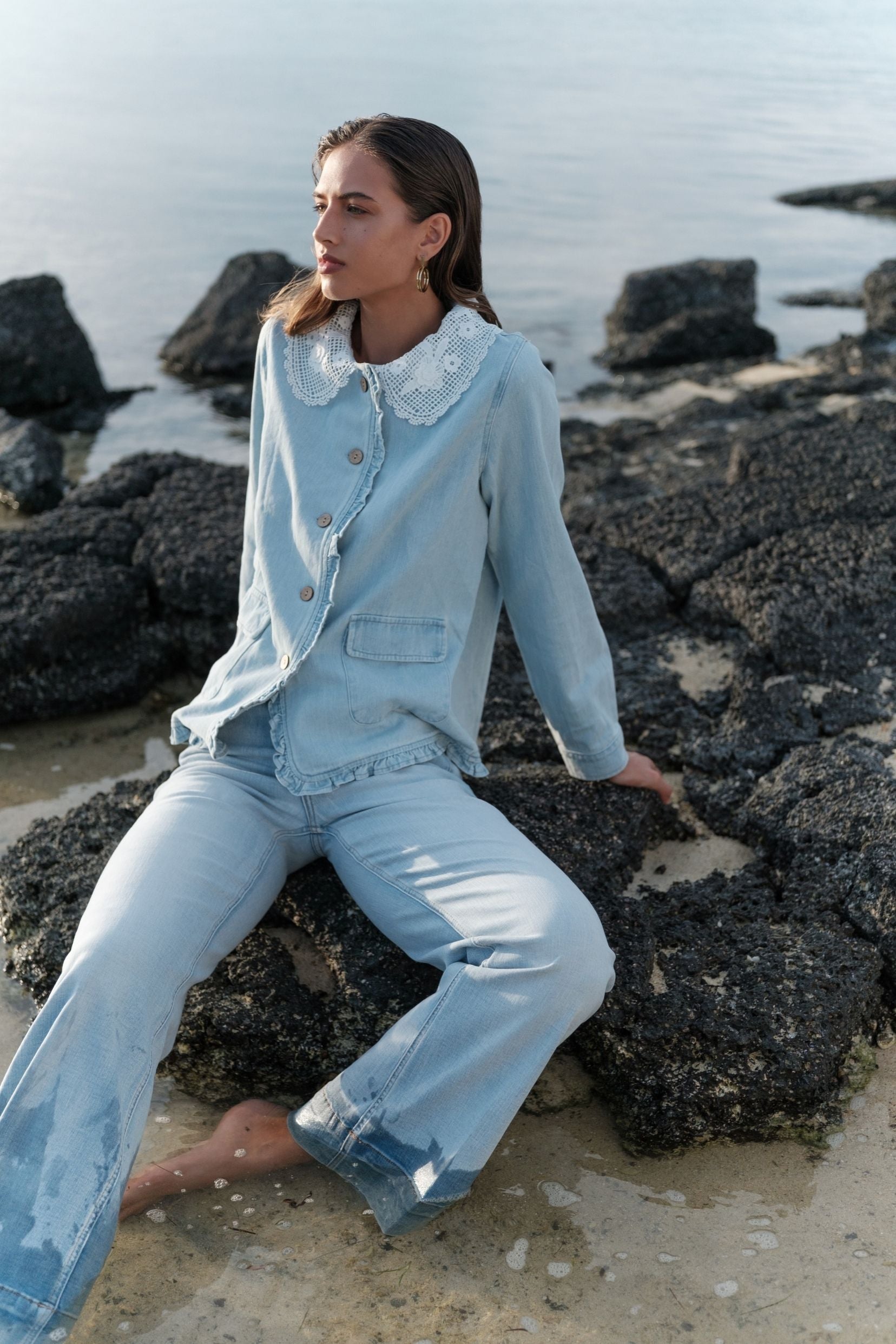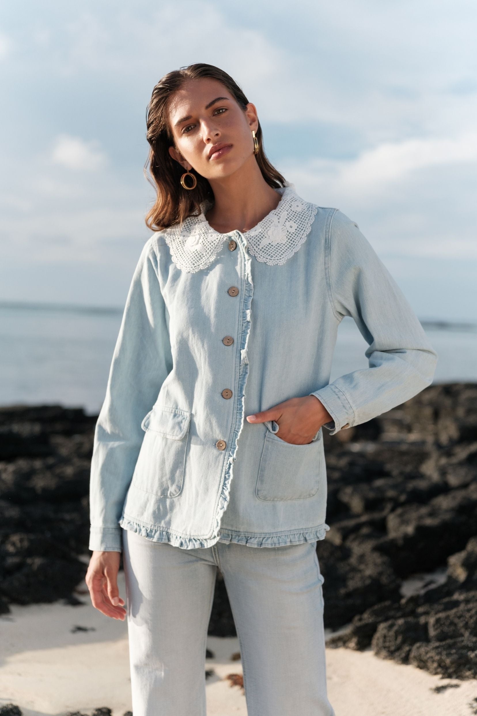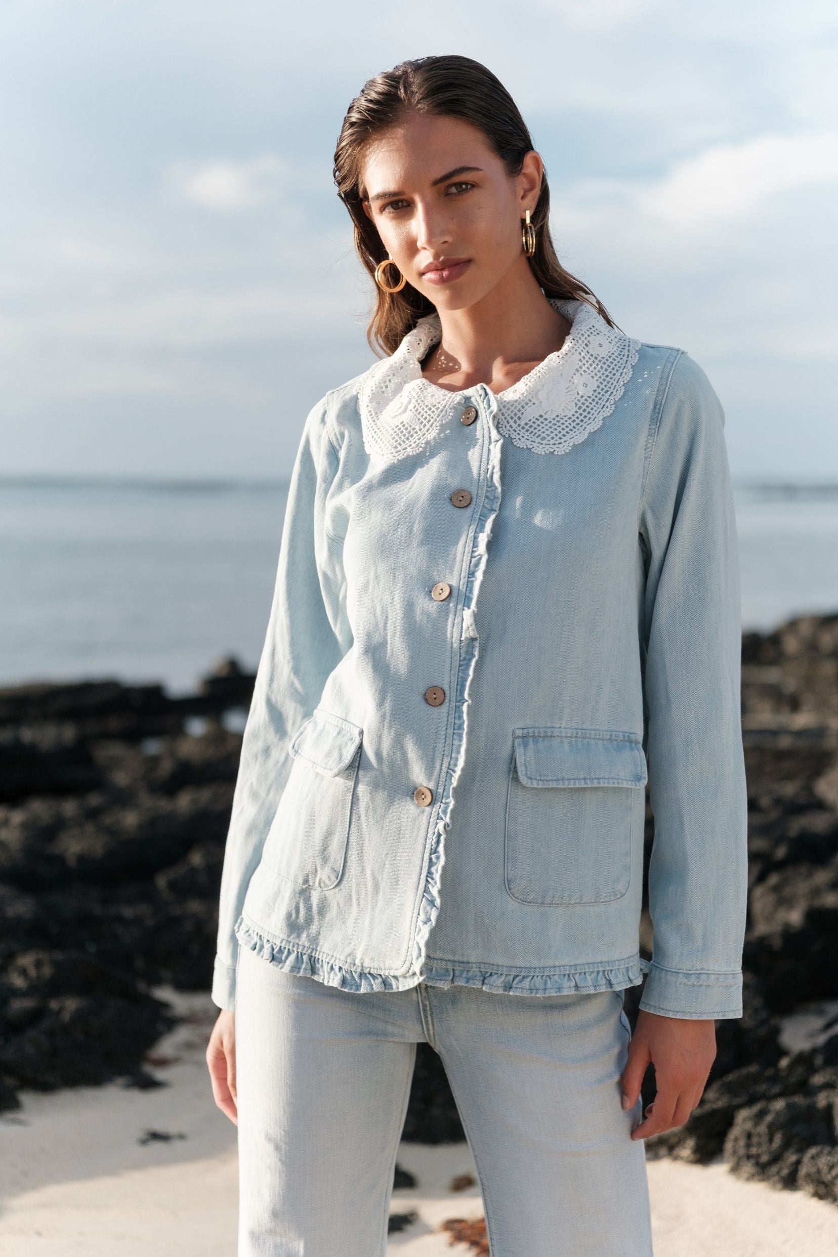 Détails : Denim de coton doux au toucher. Col en dentelle délicate, poches plaquées, boutons effet bois et finitions volantées en bas pour une touche féminine et raffinée.