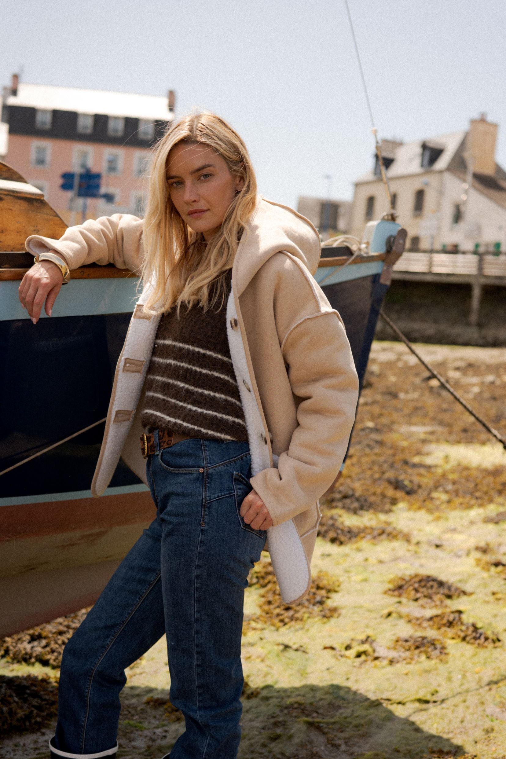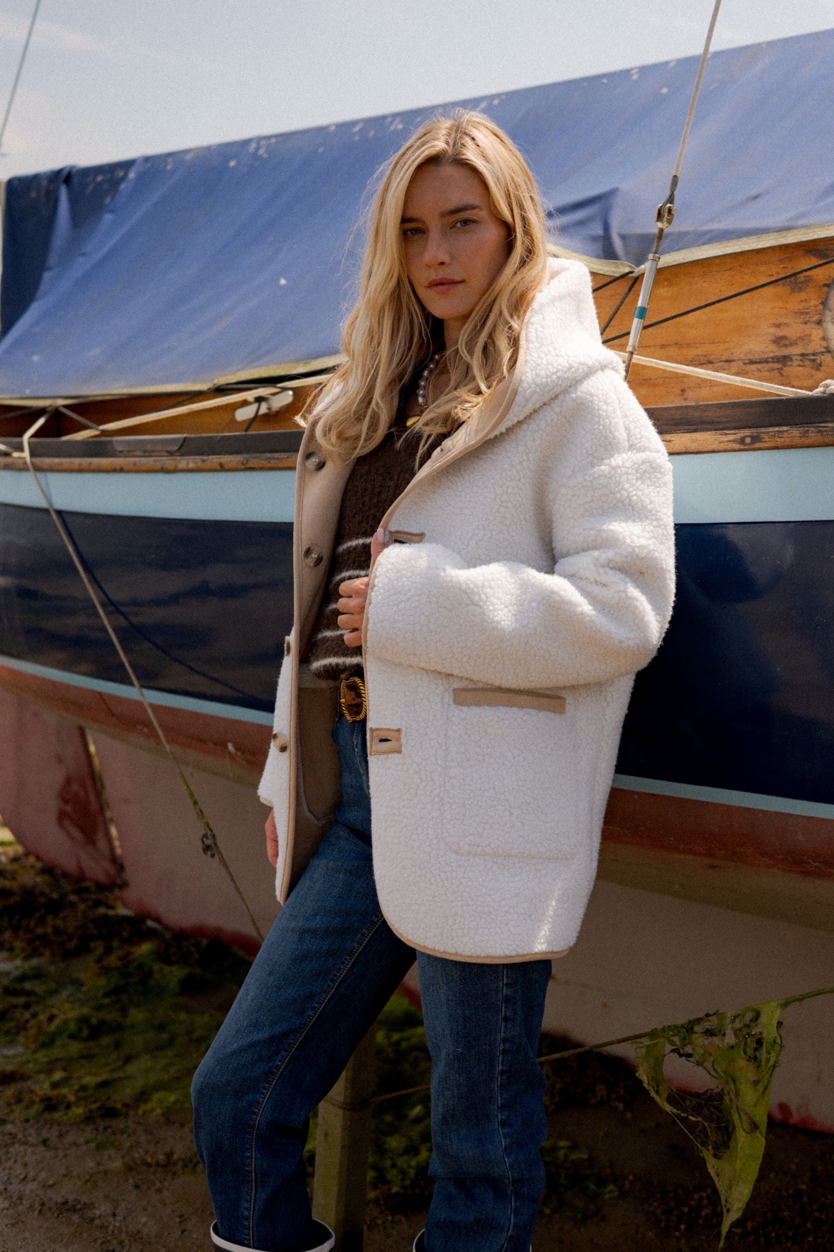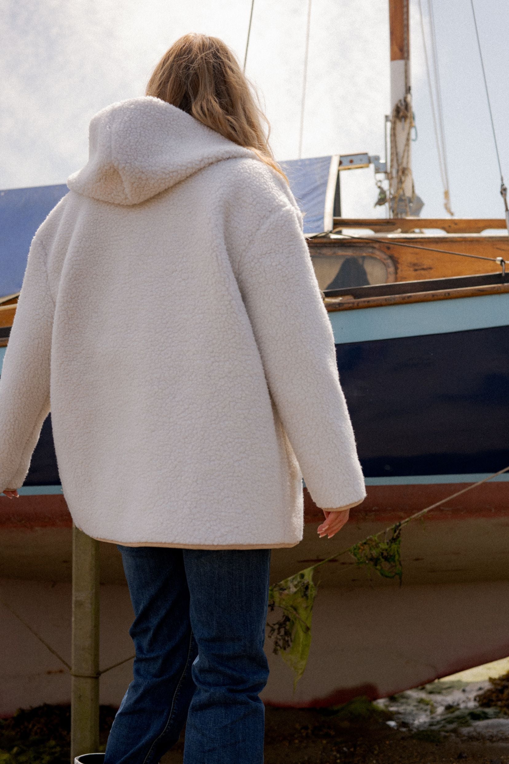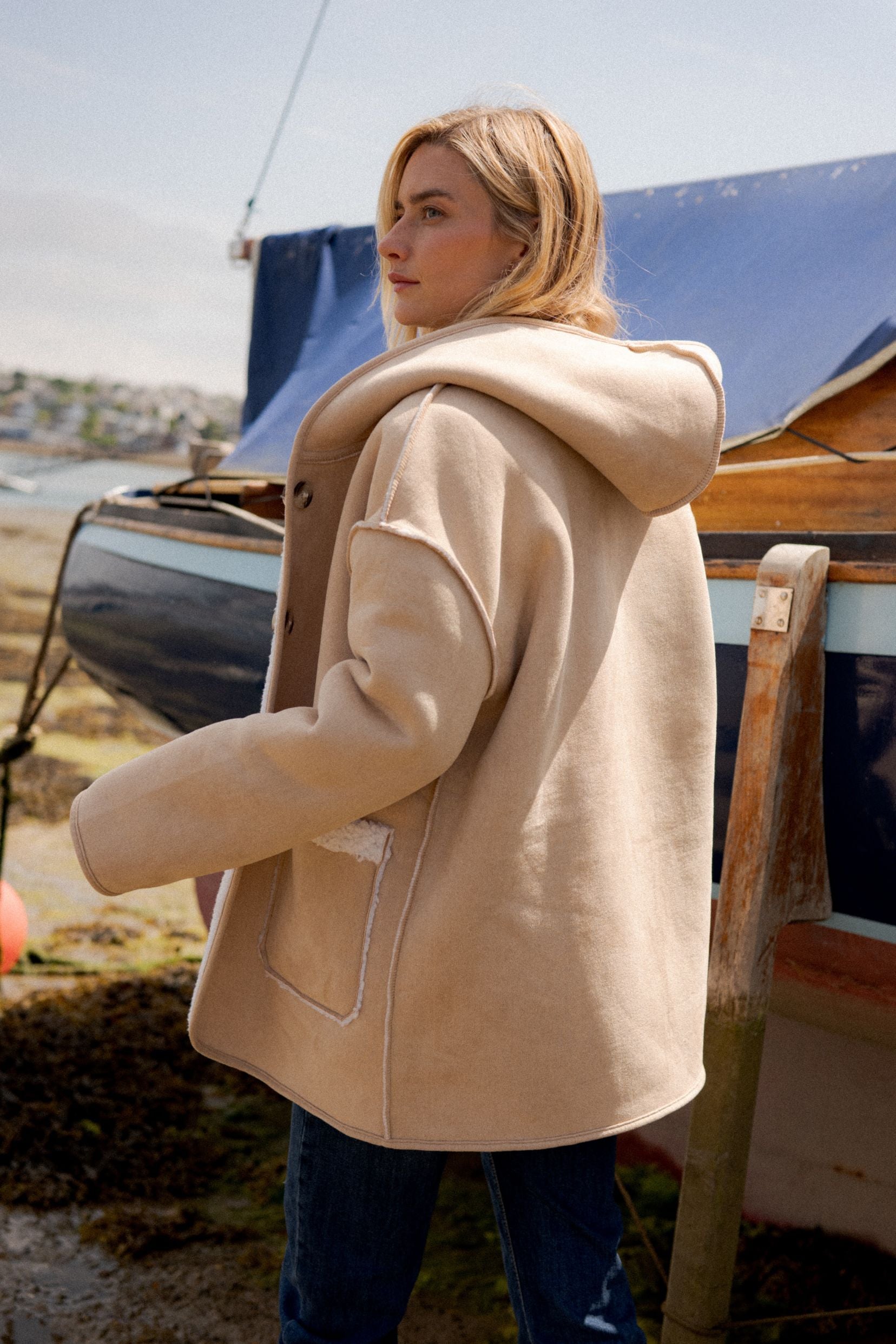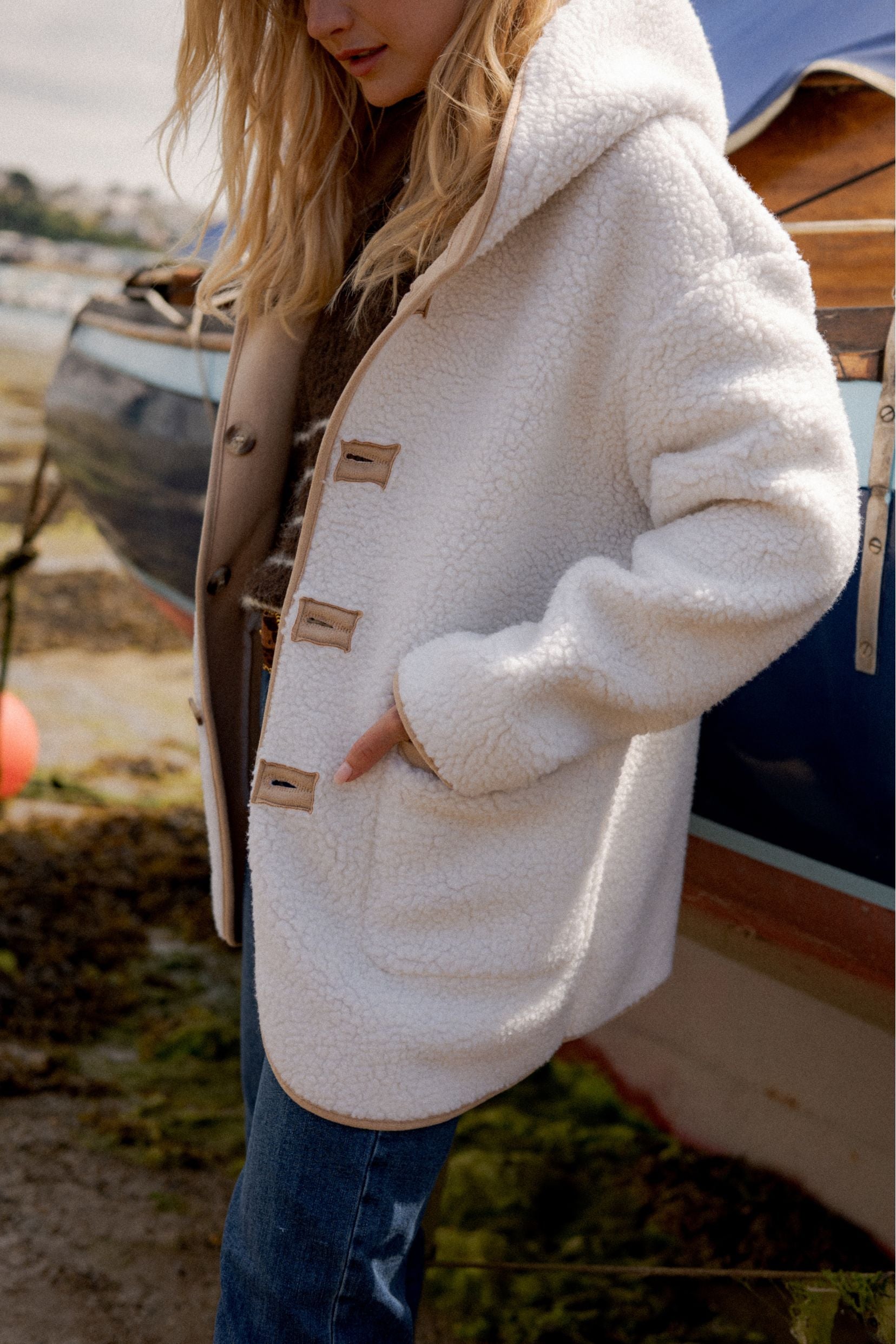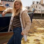Détails : Réversible deux-en-un, côté sherpa écru ultra doux ou côté beige clair pour un style plus sobre — finitions contrastées, poches plaquées pratiques.