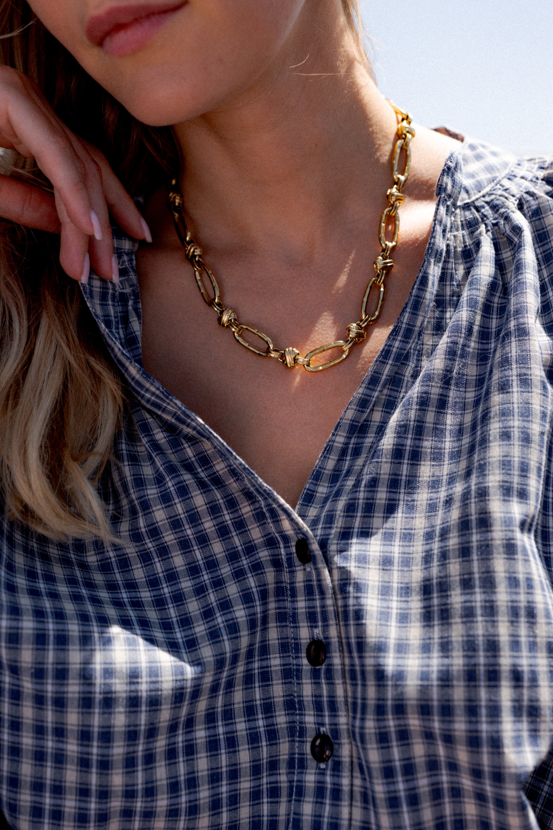 • Design : Maillons ovales martelés reliés par de petits nœuds en métal doré