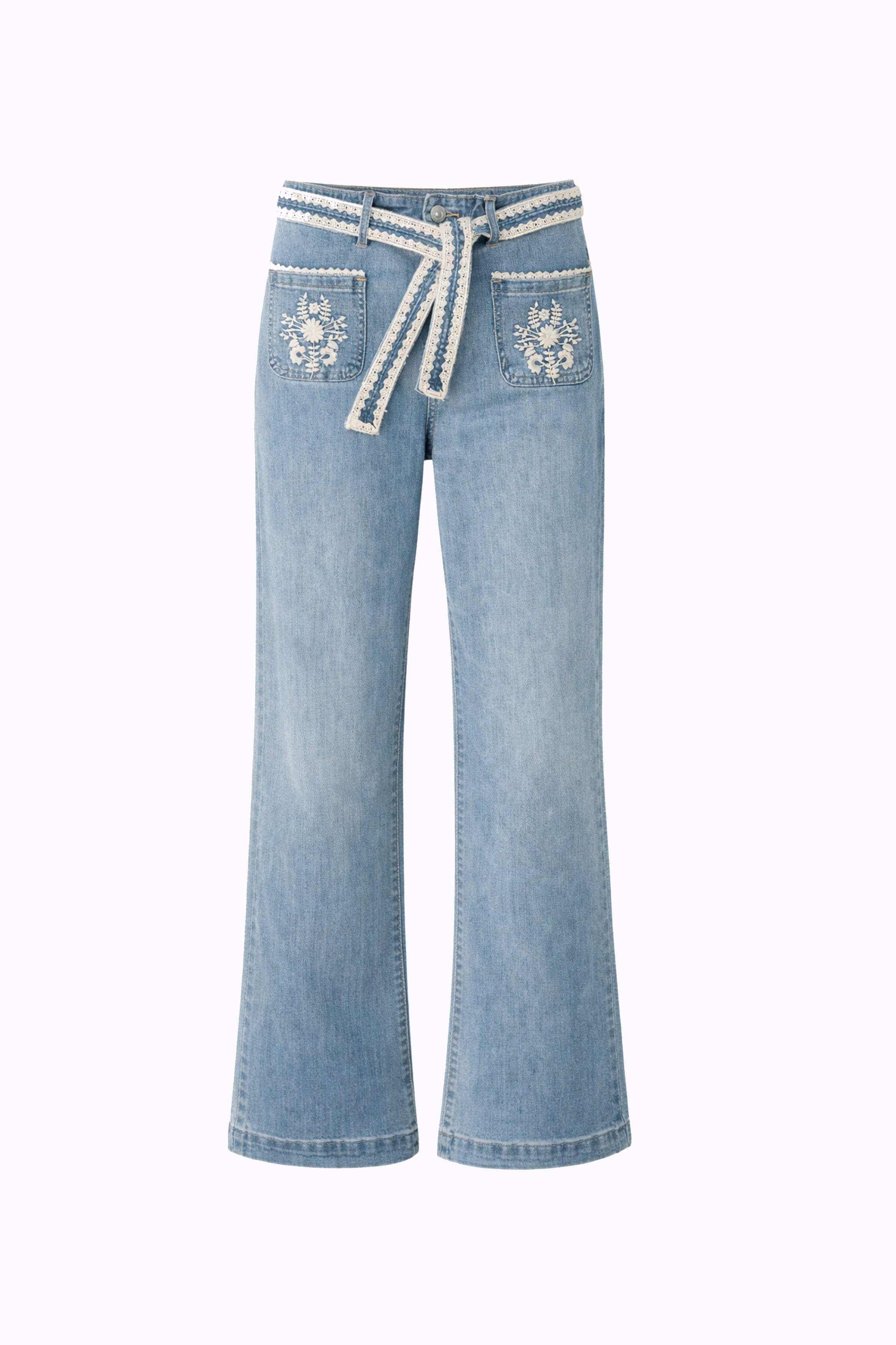 Détails : Denim coton souple. Ceinture intégrée en galon crochet nouable, poches brodées à l’avant avec motifs floraux délicats. Finitions soignées, touche artisanale signature.