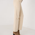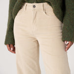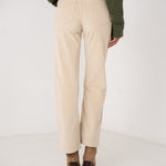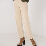 Velours côtelé épais et doux, ton écru lumineux, fermeture zippée et bouton métallique, poches classiques.