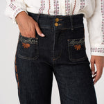 Le jean Olivia c’est l’esprit bohème chic incarné. Il combine structure et poésie avec ses broderies délicates, pour une silhouette subtilement travaillée.