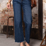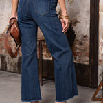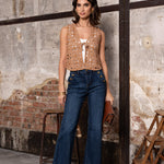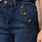 Jeans flare com bolsos laterais, decorados com botões em formato de coração em ouro velho, conferindo um toque atemporal e vintage.