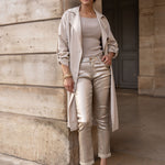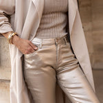 Pantalon enduit fourré intérieur, irrisé or/argent, au sublime détail de surpiqure brodée sur les poches avants