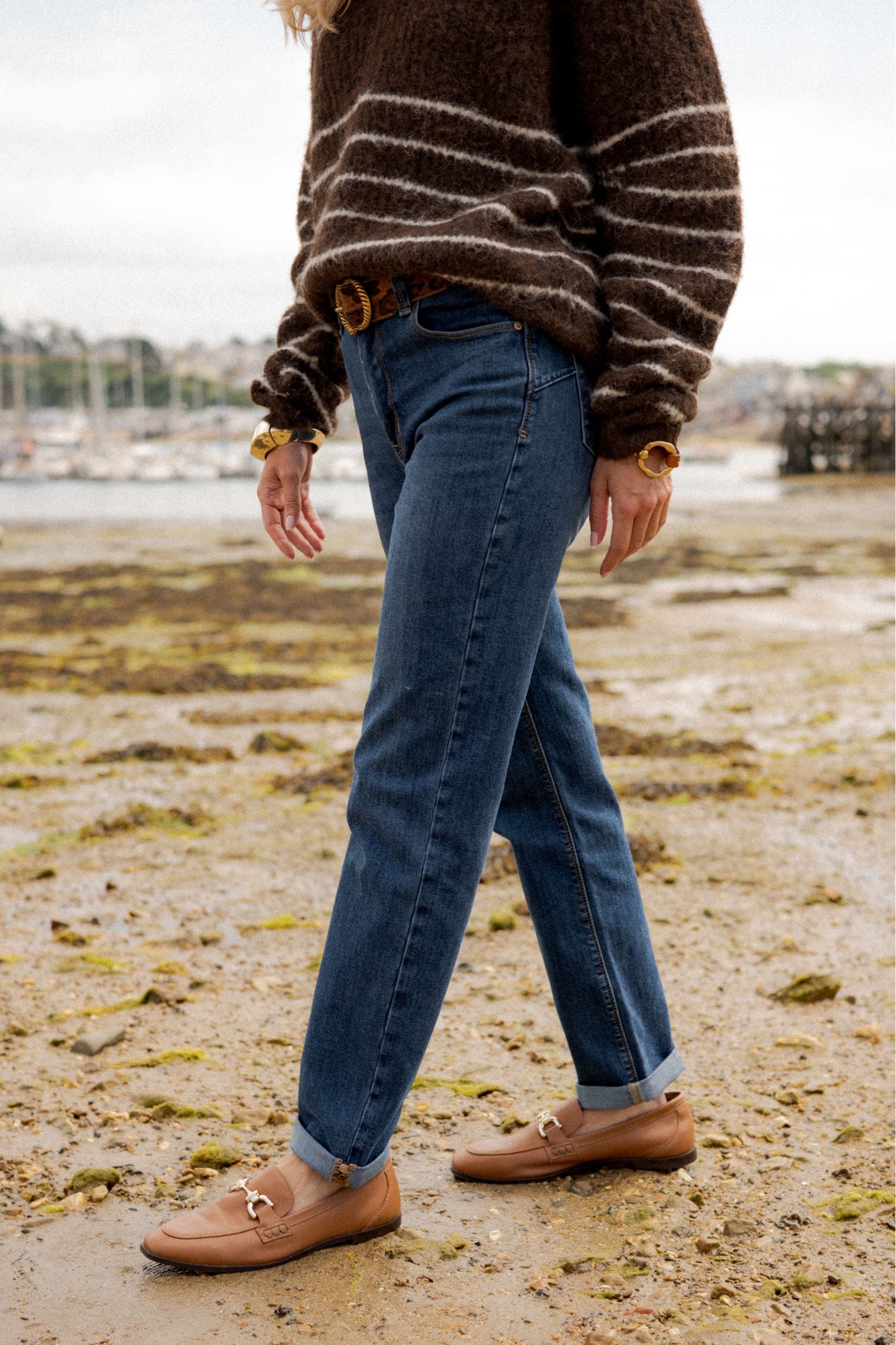 Coupe : Taille haute, jambe droite et bas retroussé pour un tombé structuré sans effort.
