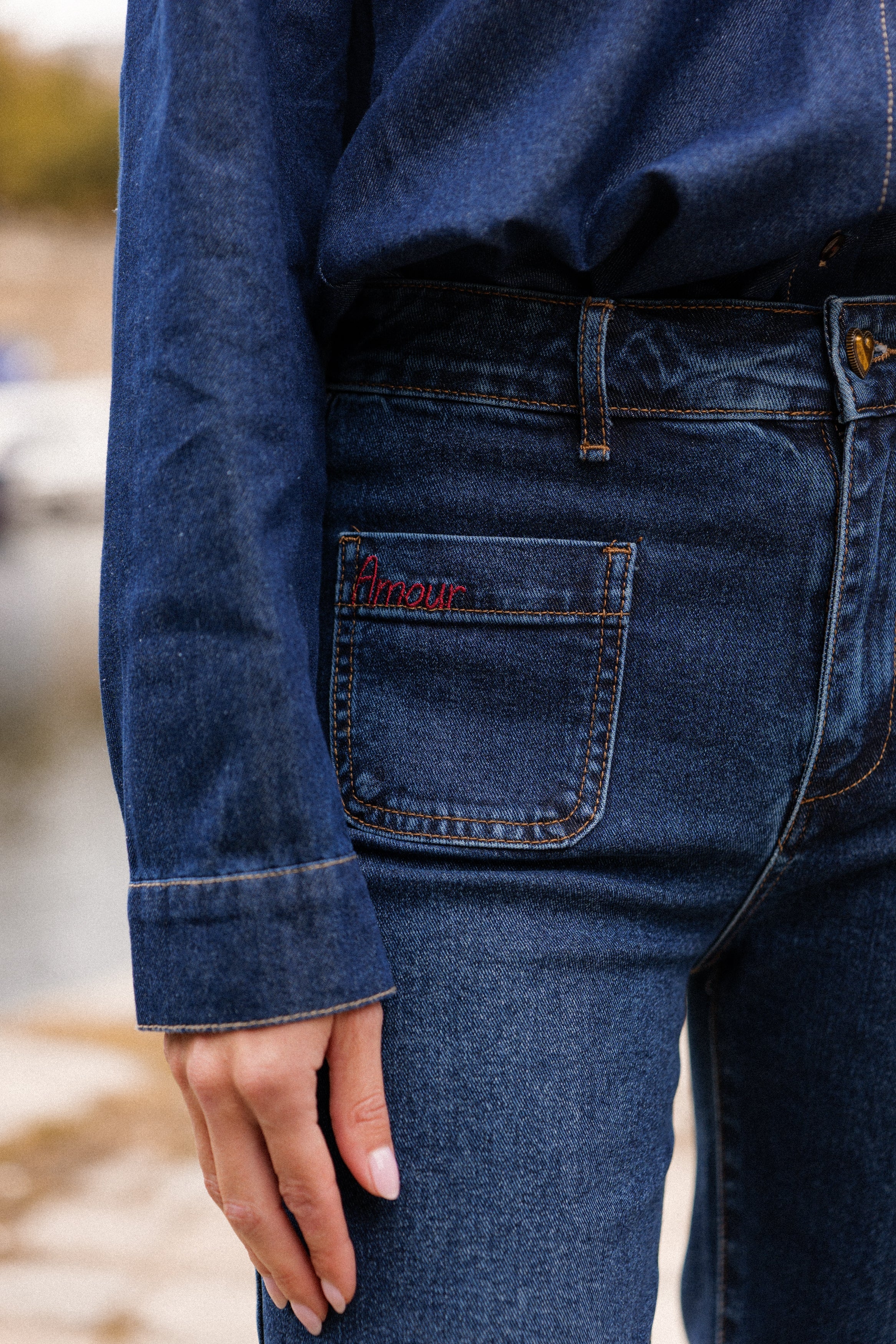 Détails : Broderies rouges signature (cœur & message) sur les poches avant, denim bleu profond