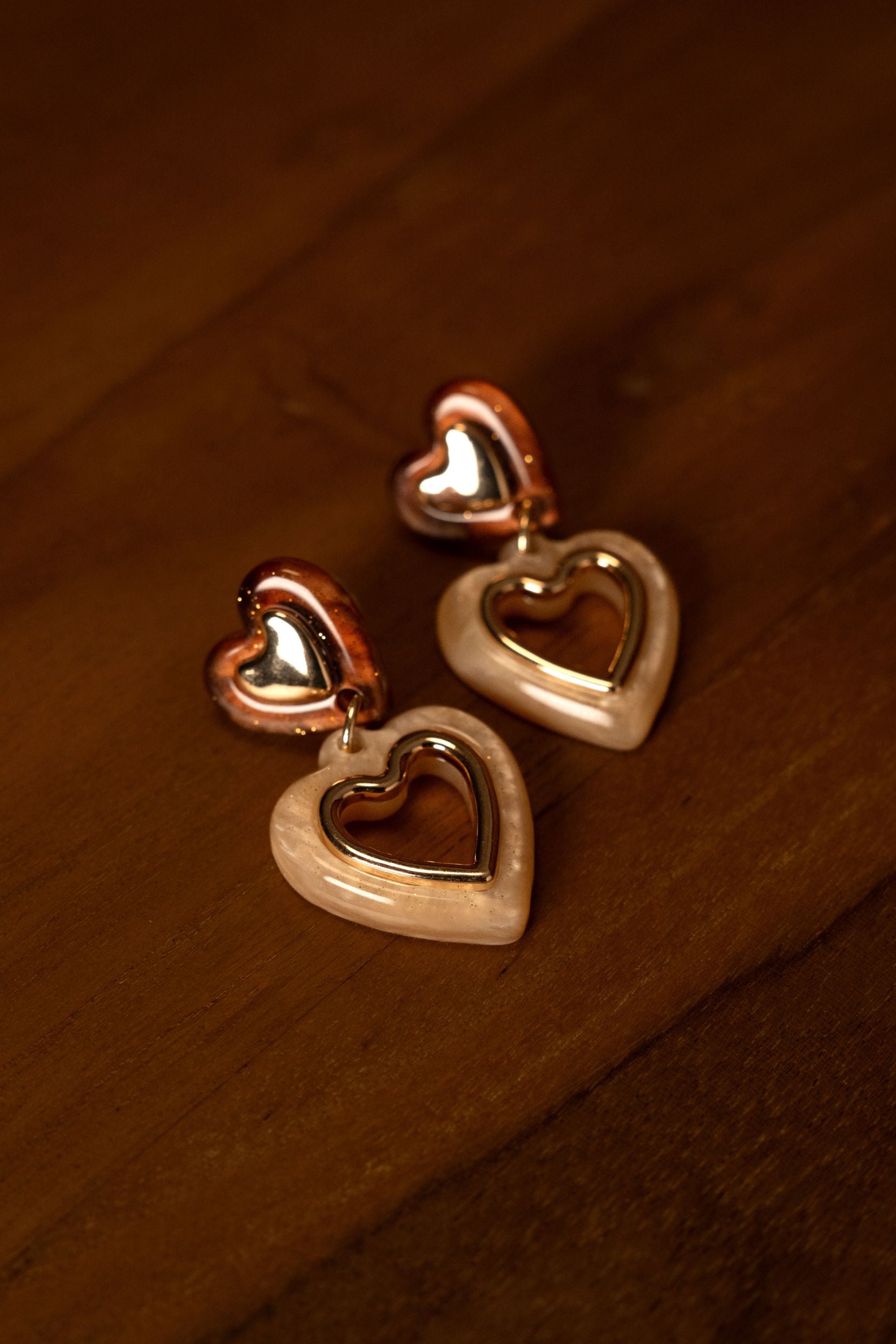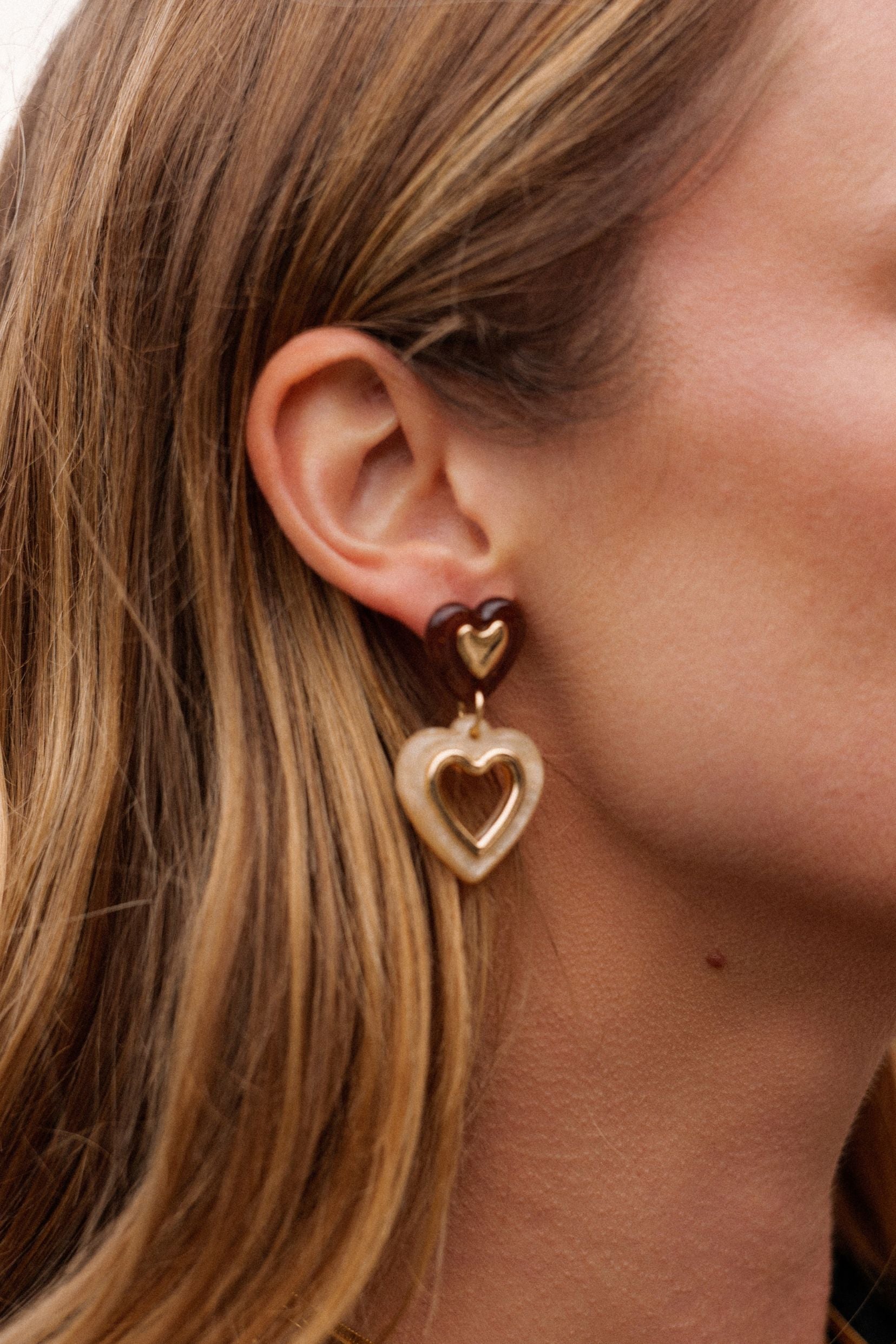 • Design : Cœur plein effet marbré en haut + cœur évidé pendant, finition dorée