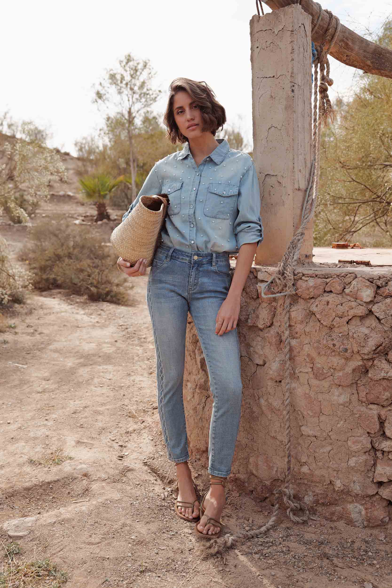 Combinando praticidade e estilo, esses jeans justos oferecem 5 bolsos funcionais, presilhas para cinto e fecho com zíper e botão para um ajuste ideal. Seu visual diferenciado está na faixa lateral ricamente decorada com lantejoulas e bordados, oferecendo um toque de brilho e glamour ao seu look.
