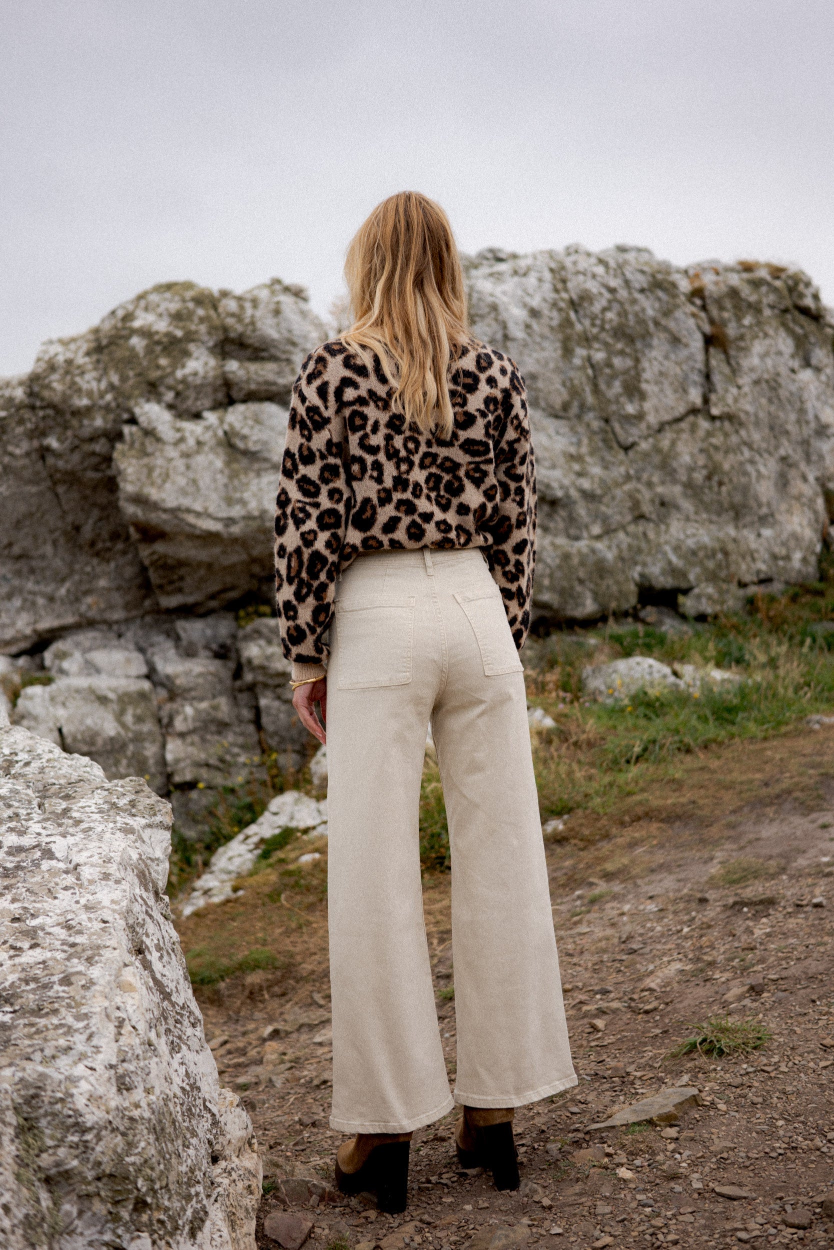 Coupe : Taille haute, jambe large, légèrement évasée. Un fit structuré qui allonge la silhouette tout en restant décontracté.