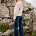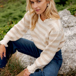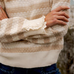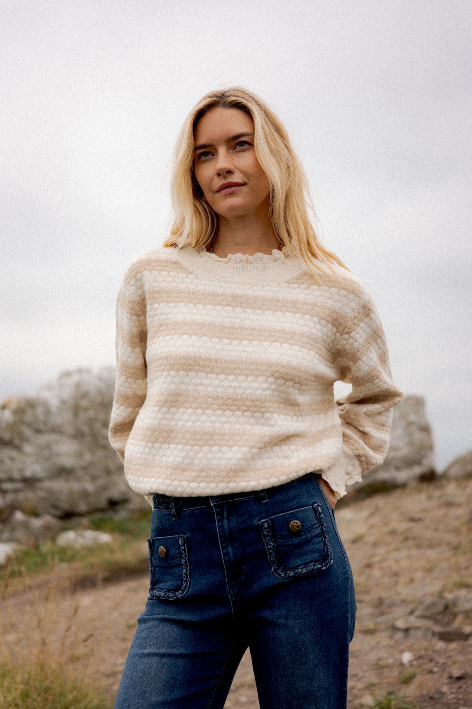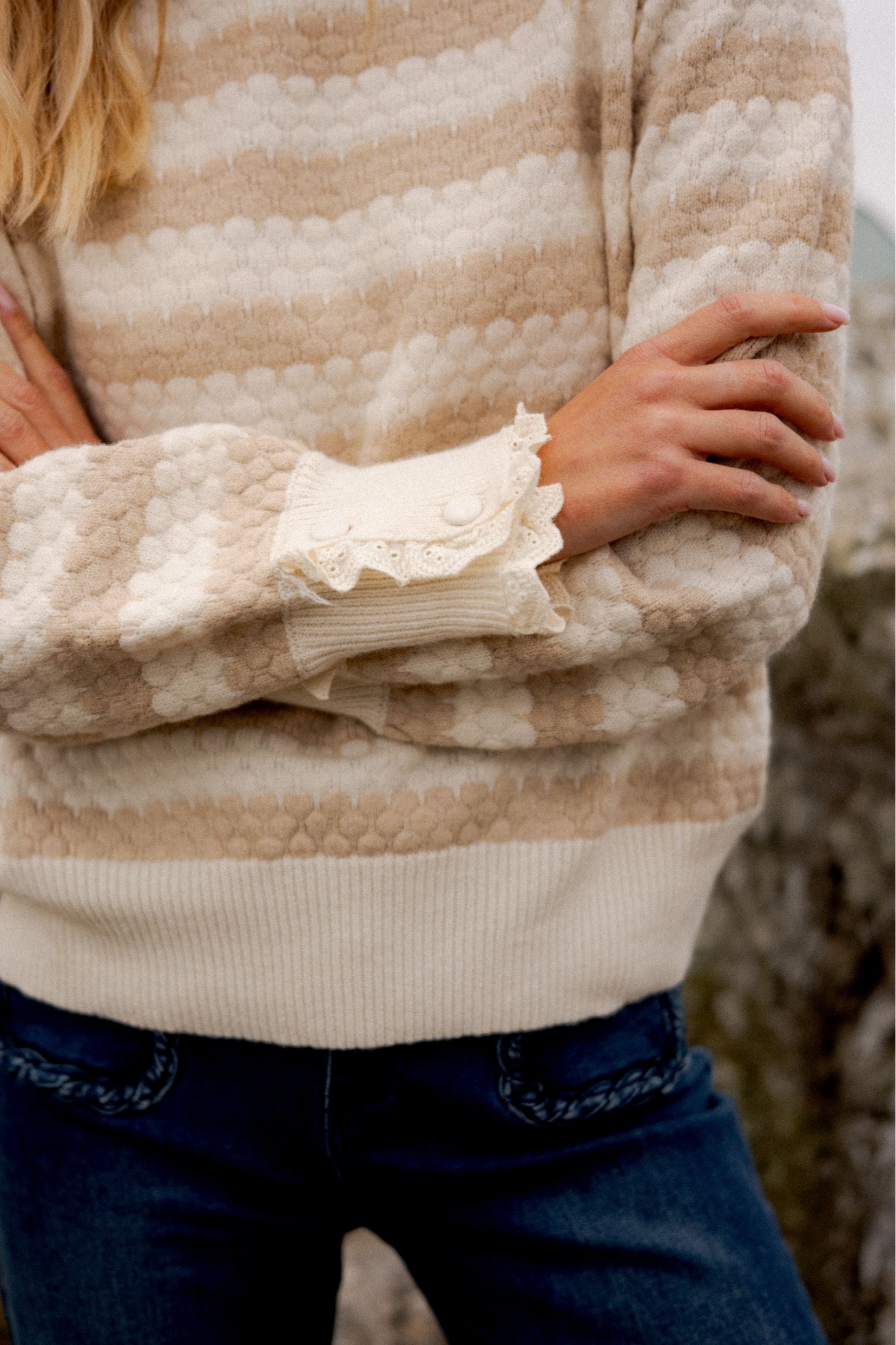 Détails : Rayures horizontales en jeu de mailles ajourées esprit pois ton sur ton, dans un dégradé vanille et beige réconfortant. Un col légèrement volanté en option pour un twist romantique.
